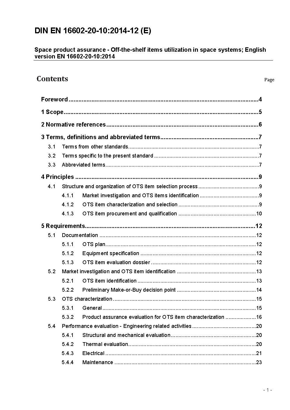 This Standard applies to all parties involved at all levels in the utilization of OTS items into space segment hardware and launchers.For the purpose of this Standard, Off-the-Shelf (OTS) Items are those that, even if not necessarily developed for space applications, can be procured from the market and utilized in a space system. This Standard contains the requirements for the utilization of OTS Items, in terms of their selection, characterization and procurement for space system use.This Standard considers complex OTS items, as for example: motherboards, cards, data storage units/items, optical equipments, photo cameras and video units, LANs, mechanical/electrical and electromechanical devices, batteries, sensors, monitoring support units, medical equipments and items, laptops. This Standard does not cover: ? software OTS,? re-use of OTS items already qualified for space applications,NOTE However, items not belonging to the same lot of the OTS item already evaluated using this standard, can be subjected to partialre-evaluation and re-qualification since, on the commercial market, fast evolution of the design occurs.? Pieces, parts and materials, such as electrical, electronic and electromechanical (EEE) parts, thermocouples, rivets, fasteners, connectors, fittings, adhesives, insulation, wiring and plumbing.This standard is not specifically addressing the re-use of OTS items for the same space application for which they were initially qualified.This standard may be tailored for the specific characteristic and constrains of a space project in conformance with ECSS-S-ST-00.