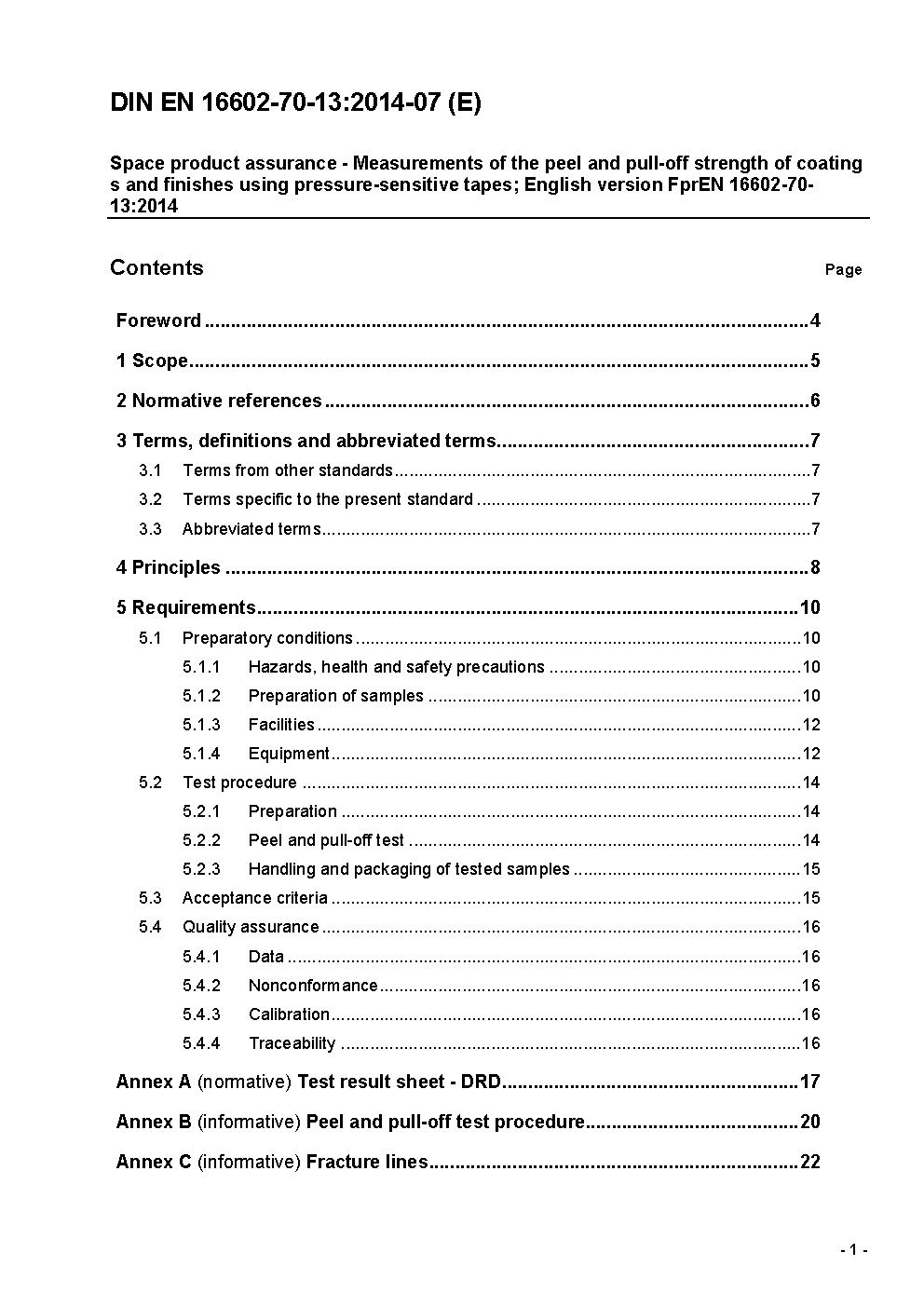 Space product assurance - Measurements of the peel and pull-off strength of coatings and finishes using pressure-sensitive tapes; English version FprEN 16602-70-13:2014