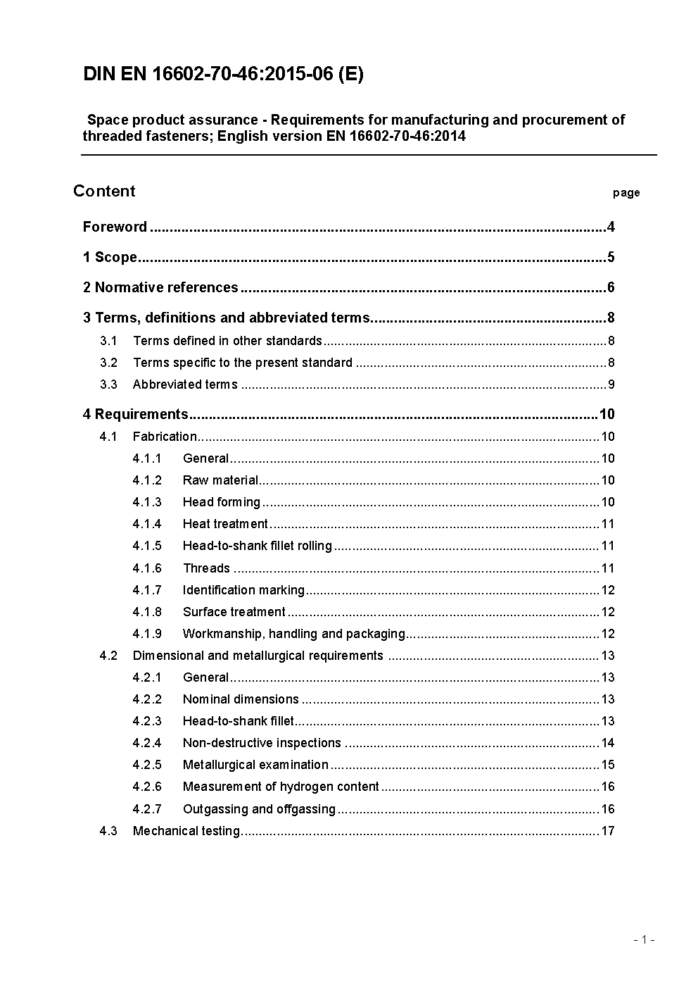 Space product assurance - Requirements for manufacturing and procurement of threaded fasteners; English version FprEN 16602-70-46:2014