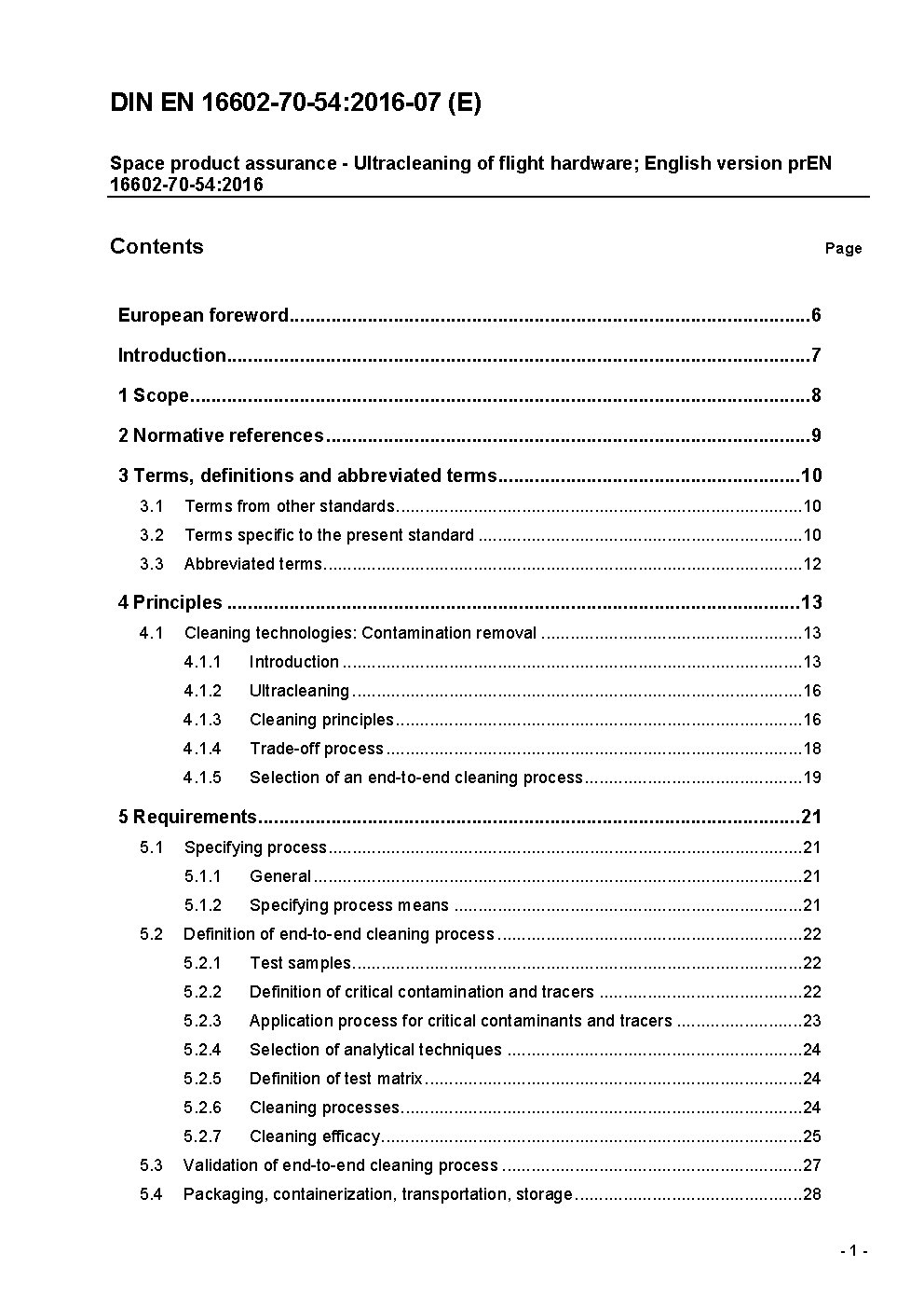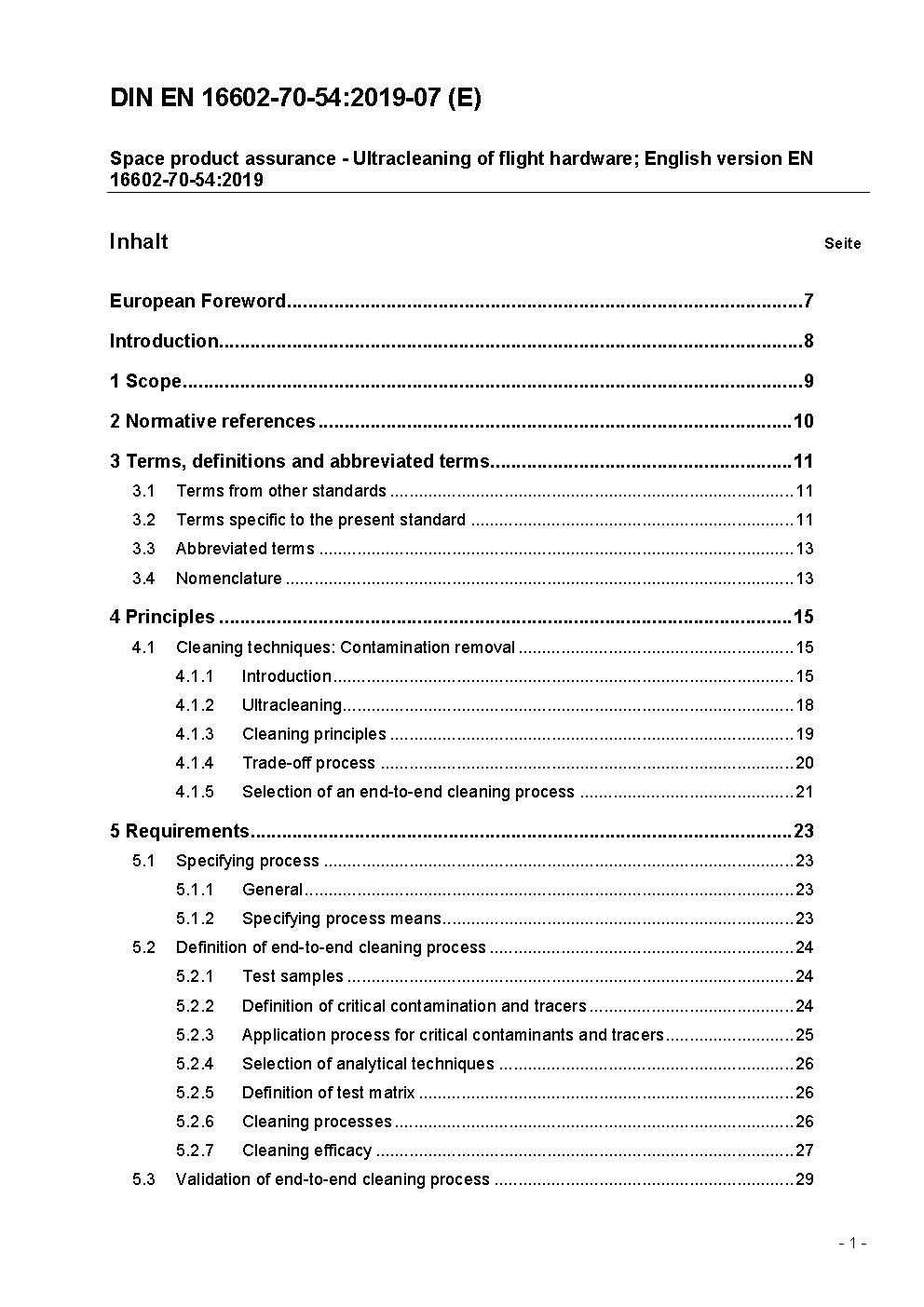 Raumfahrtproduktsicherung - Ultra-Reinigung von Flug-Hardware; Englische Fassung EN 16602-70-54:2019
