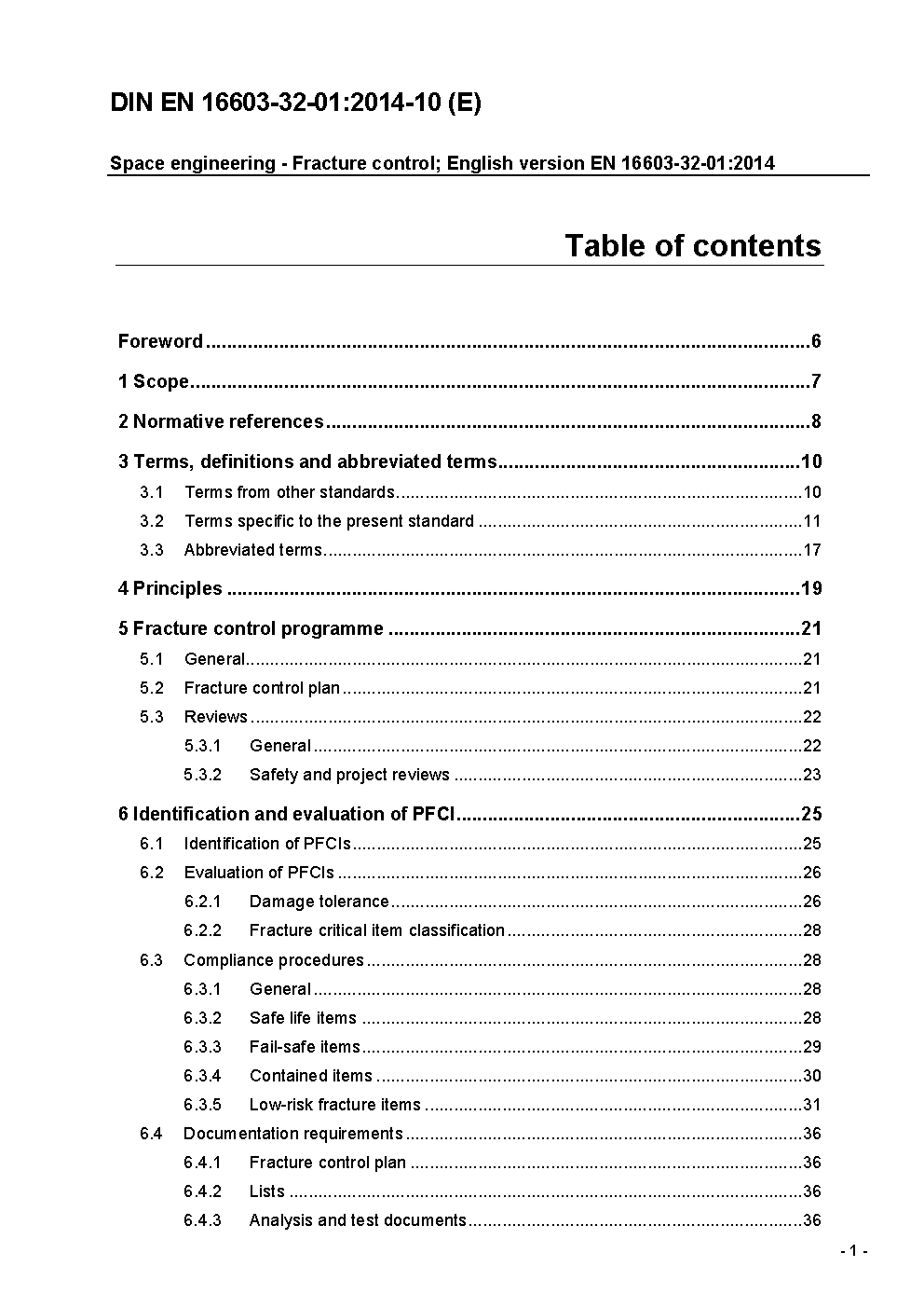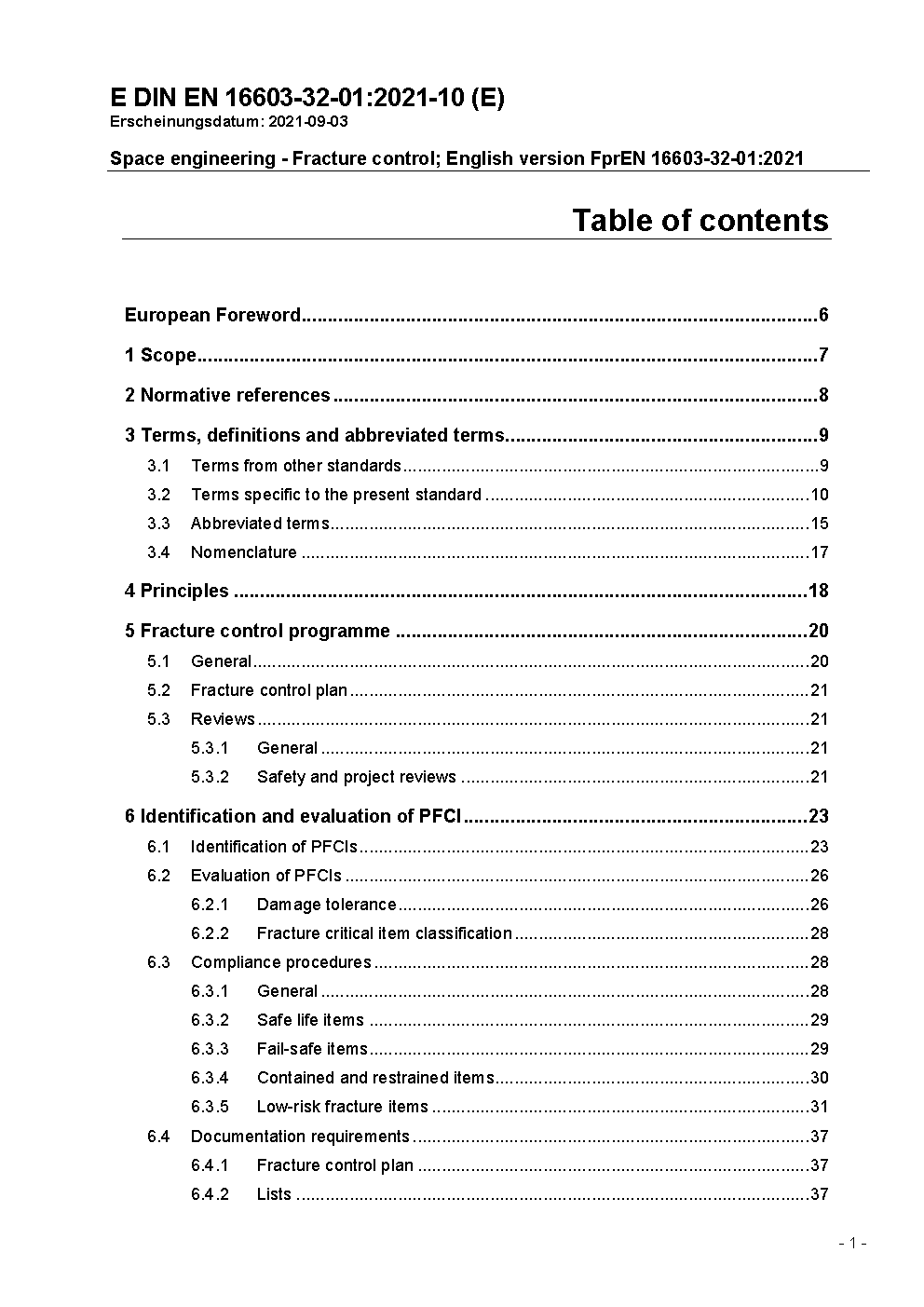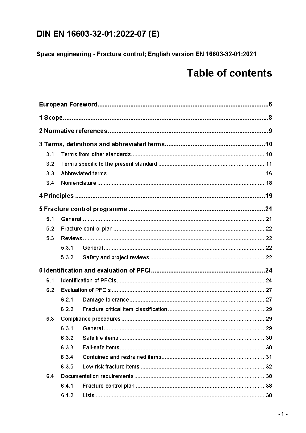 Space engineering - Fracture control; English version EN 16603-32-01:2021