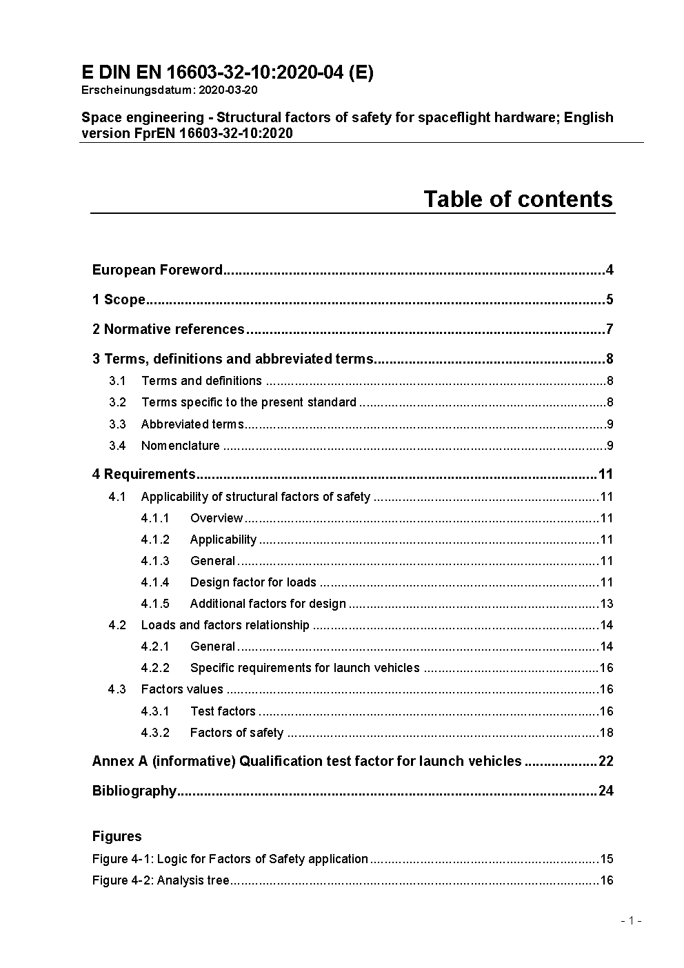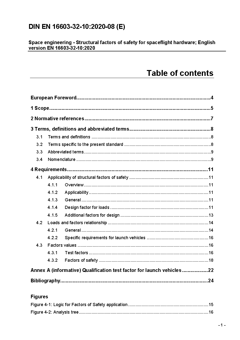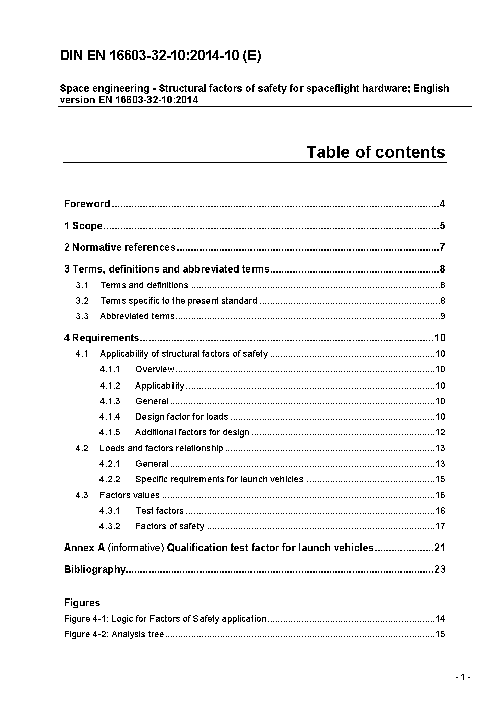 The purpose of this Standard is to define the Factors Of Safety (FOS), Design Factor and additional factors to be used for the dimensioning and design verification of spaceflight hardware including qualification and acceptance tests.This standard is not self standing and is used in conjunction with the ECSS-E-ST-32, ECSS-E-ST-32-02 and ECSS-E-ST-33-01 documents.Following assumptions are made in the document: ? that recognized methodologies are used for the determination of the limit loads, including their scatter, that are applied to the hardware and for the stress analyses;? that the structural and mechanical system design is amenable to engineering analyses by current state-of-the-art methods and is conforming to standard aerospace industry practices.Factors of safety are defined to cover chosen load level probability, assumed uncertainty in mechanical properties and manufacturing but not a lack of engineering effort.The choice of a factor of safety for a program is directly linked to the rationale retained for designing, dimensioning and testing within the program. Therefore, as the development logic and the associated reliability objectives are different for:? unmanned scientific or commercial satellite, ? expendable launch vehicles,? man-rated spacecraft, and? any other unmanned space vehicle (e. g. transfer vehicle, planetary probe) specific values are presented for each of them.Factors of safety for re-usable launch vehicles and man-rated commercial spacecraft are not addressed in this document.For all of these space products, factors of safety are defined hereafter in the document whatever the adopted qualification logic: proto-flight or prototype model.For pressurized hardware, factors of safety for all loads except internal pressure loads are defined in this standard. Concerning the internal pressure, the factors of safety for pressurised hardware can be found in ECSS-E-ST-32-02. For loads combination refer to ECSS-E-ST-32-02.For mechanisms, specific factors of safety associated with yield and ultimate of metallic materials, cable rupture factors of safety, stops/shaft shoulders/recess yield factors of safety and limits for peak Hertzian contact stress are specified in ECSS-E-ST-33-01.Alternate approachThe factors of safety specified hereafter are applied using a deterministic approach i.e. as generally applied in the Space Industry to achieve the structures standard reliability objectives. Structural safety based on a probabilistic analysis could be an alternate approach but it has to be demonstrated this process achieves the reliability objective specified to the structure. The procedure is approved by the customer.This standard may be tailored for the specific characteristics and constraints of a space project in conformance with ECSS-S-ST-00.