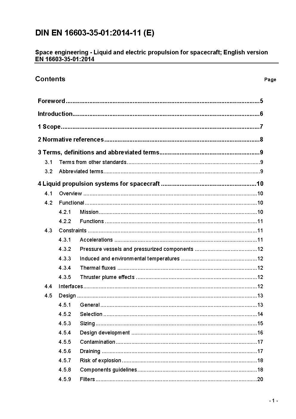 This Standard defines the regulatory aspects applicable to elements and processes for liquid, including cold gas, and electrical propulsion for spacecraft. It specifies the activities to be performed in the engineering of such propulsion systems, their applicability, and defines the requirements for the engineering aspects: functional, interfaces, environmental, design, quality factors, operational and verification.General requirements applying to all type of Propulsion Systems Engineering are defined in ECSS-E-ST-35.This standard may be tailored for the specific characteristics and constraints of a space project in conformance with ECSS-S-ST-00.
