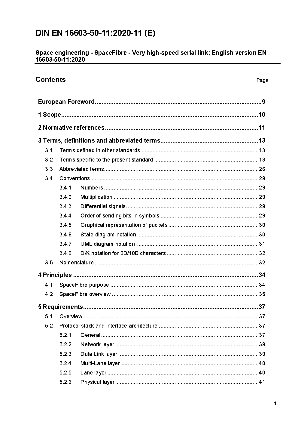 The scope of the SpaceFibre standard is the detailed specification a very high-speed serial link protocol stack reaching from link level Quality layer down to the Physical layer. The higher layers like packet, network and higher level protocols are the same as for SpaceWire and specified in the respective standards ECSS-E-ST-50-12C and ECSS-E-ST-50-51C to 53C.