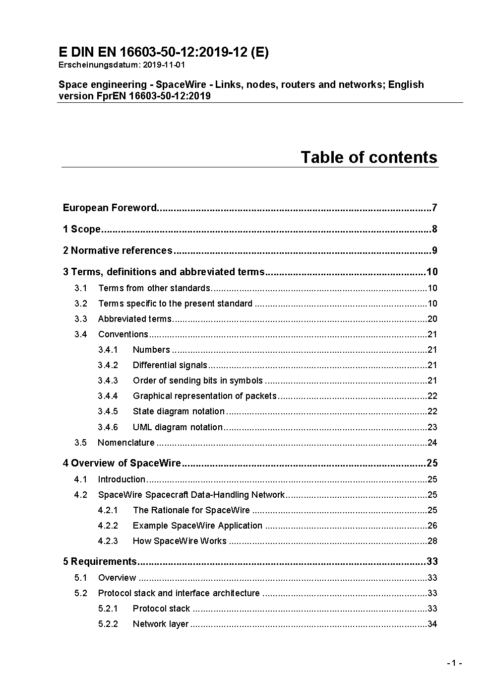 Raumfahrttechnik - SpaceWire - Verbindungen, Knoten, Router und Netzwerke; Englische Fassung FprEN 16603-50-12:2019
