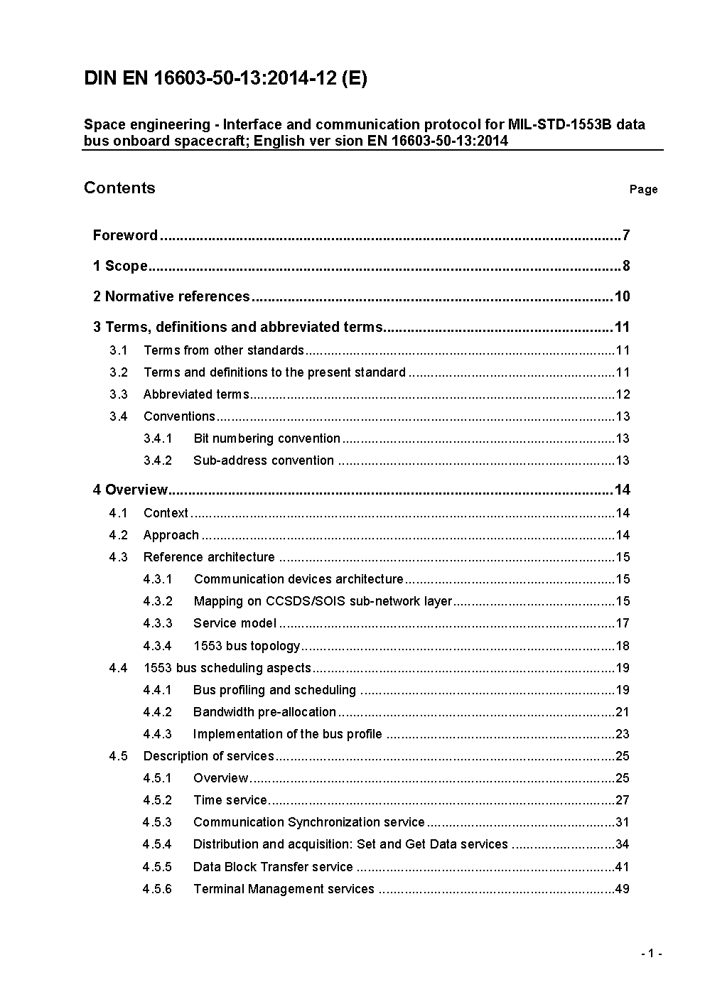 Using standard communication protocols for spacecraft communication links can provide interface compatibility between communication devices and components. Thus, it can improve the design and development process as well as integration and test activities at all levels,and provide the potential of reusability across projects.The aim of this space engineering standard is to define the interface services and to specify their corresponding bus protocol elements for spacecraft using the MIL-STD-1553B data bus. It also aims at defining requirements for harmonisation of physical interface and usage of the MIL-STD-1553B data link layer features.Another goal of this standard is to facilitate the bus profiling task by proposing a message scheduling scheme to the mission system architects. Such framework helps to homogenise the allocation and control of communication resources across a single project or spacecraft mission.The scope of this standard is as follows:? It details the usage of the MIL-STD-1553B.? It covers the communication protocols, services and functions needed for exchange of information over MIL-STD-1553B data bus.? It is limited to necessary and sufficient requirements to ensure compatibility for communication through MIL-STD-1553B data bus for communication devices onboard a spacecraft and across projects.? It covers a wide spectrum of mission needs.? It does not modify requirements that are under the scope of MIL-STD-1553B.? It covers recommendation for verification and test of communication devices communicating through a MIL-STD-1553 data bus.This Standard provides a comprehensive set of requirements for all communication devices and components onboard a spacecraft, whichare connected to a single (redundant) data bus according to MIL-STD-1553B.Although the standard focuses on the specification of single-bus architecture, questions related to multiple-bus-architectures or the use of repeaters for separable busses (for launchers) are also addressed.This Standard aims at specifying requirements that are technically feasible, correct, consistent and compliant with the needs and overall technological approach and industrial policies of the participating Agencies and Industry. This standard may be tailored for the specific characteristic and constrains of a space project in conformance with ECSS-S-ST-00.