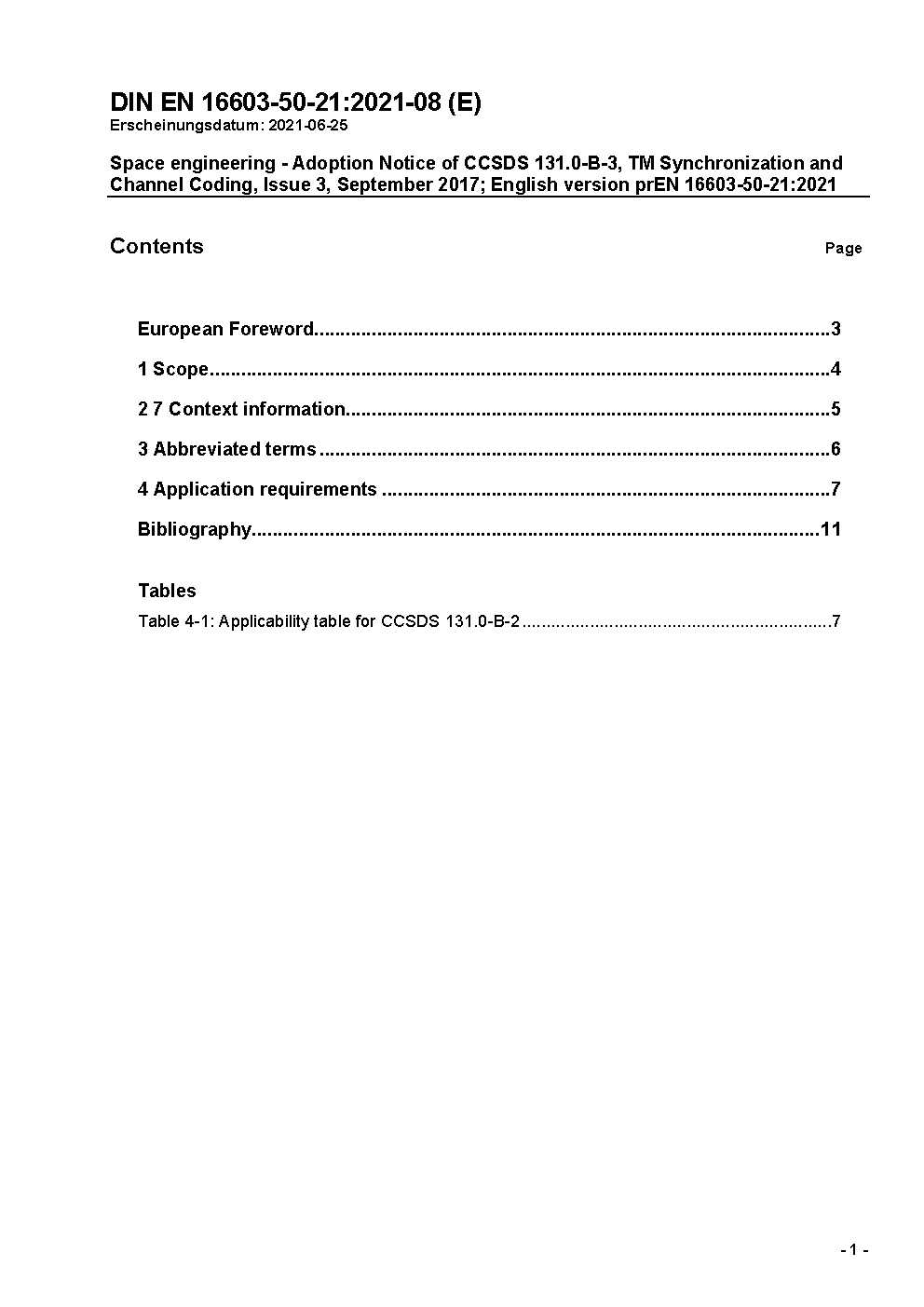 Raumfahrttechnik - Adoption Notice von CCSDS 131.0-B-3, TM-Synchronisation und Kanalcodierung, Ausgabe 3, September 2017; Englische Fassung prEN 16603-50-21:2021