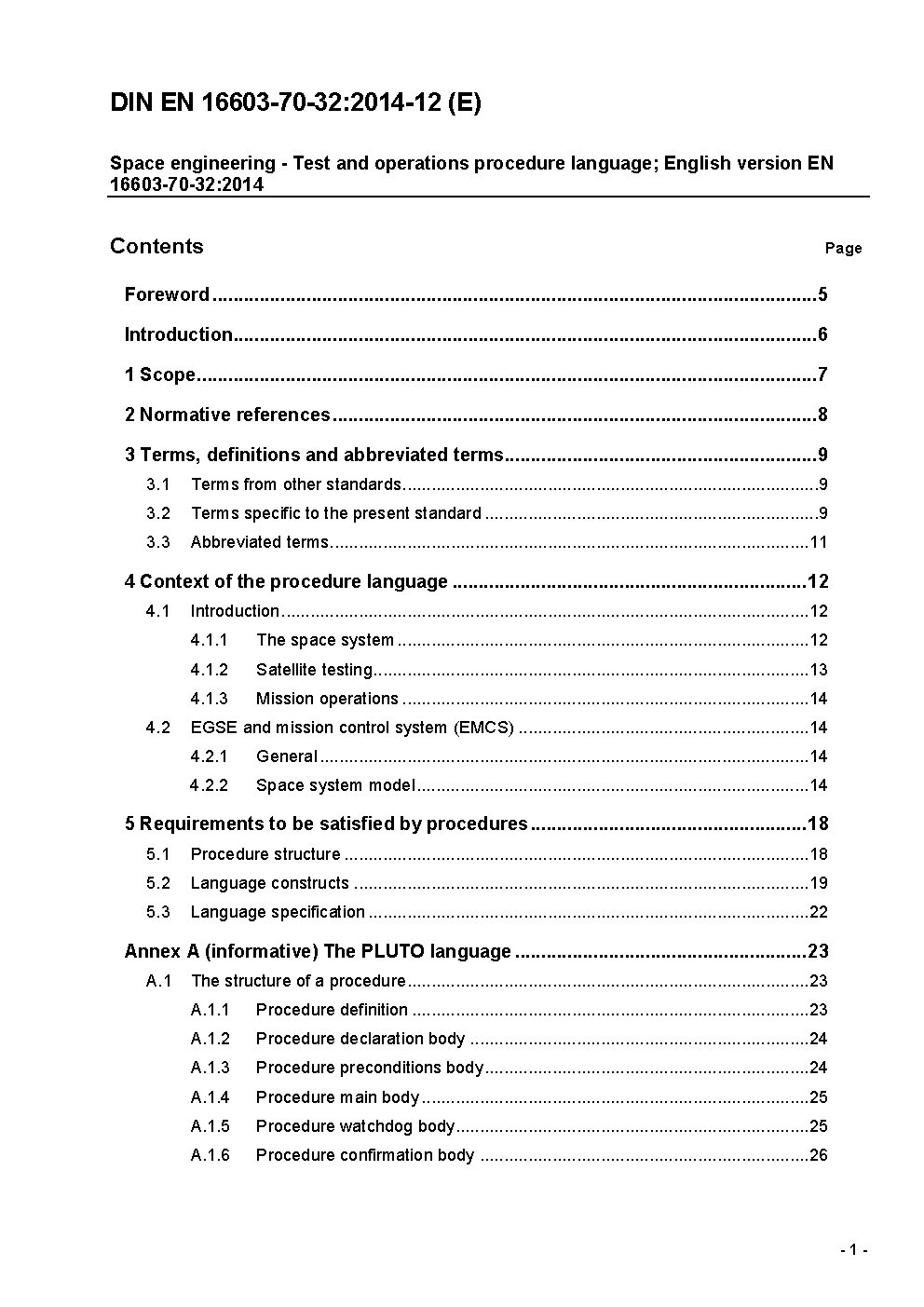 This Standard specifies:? The capabilities of the language used for the definition of procedures for space system testing and operations.? The PLUTO language.Clause 4 defines the context in which procedures operate.Clause 5 contains the requirements for the procedure language.Annex A specifies the PLUTO language. This includes:? The ?building blocks? that constitute procedures and the role that each of these building blocks plays in achieving the overall objectivesof the procedure.? The dynamic aspects of procedures i.e. the execution logic of each building block and execution relationships between these blocks.? The syntax and semantics of the language itself.Annex B specifies the engineering units to be supported by the procedure language.Annex C specifies the mathematical, time and string functions to be supported by the procedure language.This standard may be tailored for the specific characteristics and constraints of a space project in conformance with ECSS-S-ST-00.