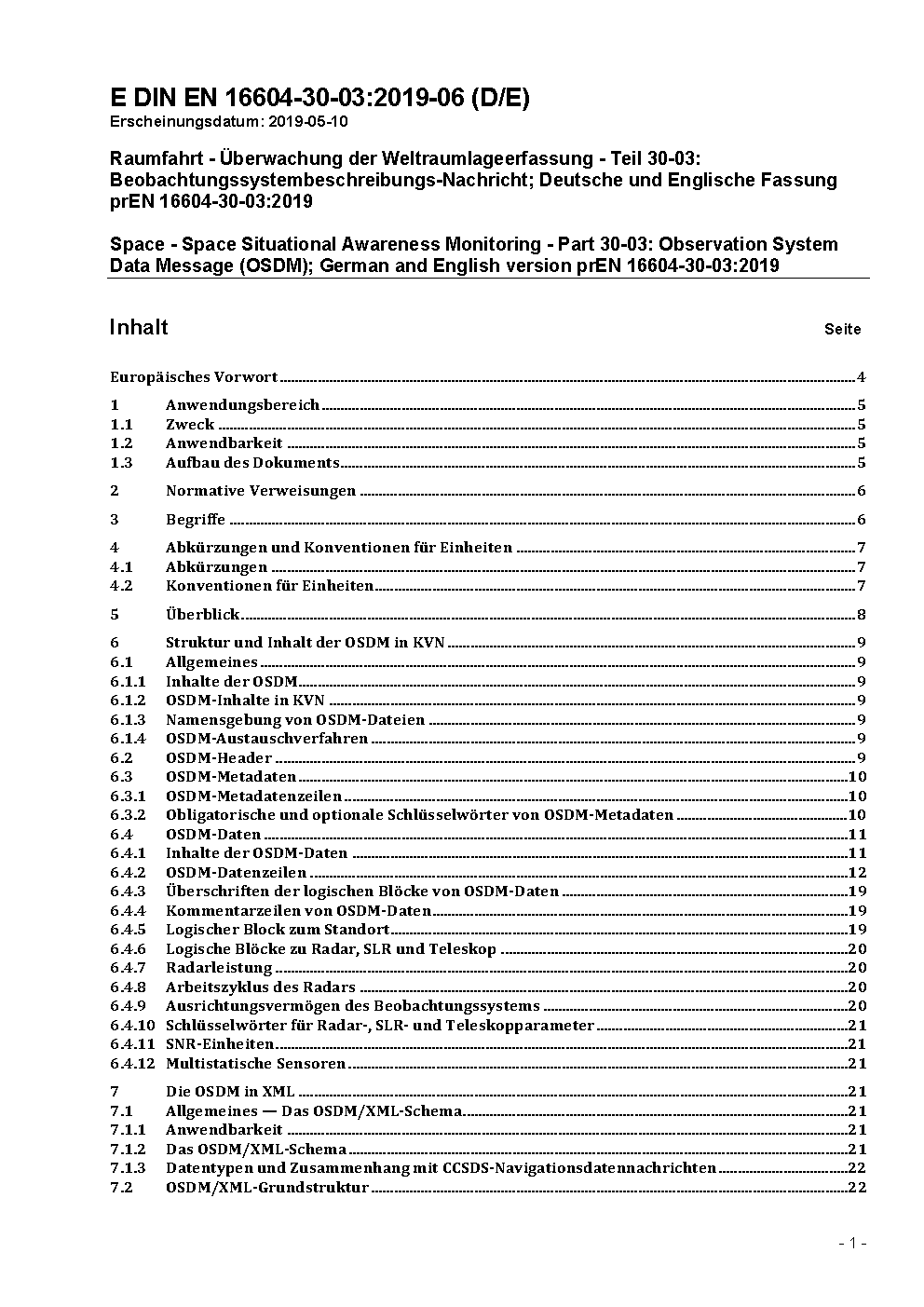 Raumfahrt - Überwachung der Weltraumlageerfassung - Teil 30-03: Beobachtungssystembeschreibungs-Nachricht; Deutsche und Englische Fassung prEN 16604-30-03:2019