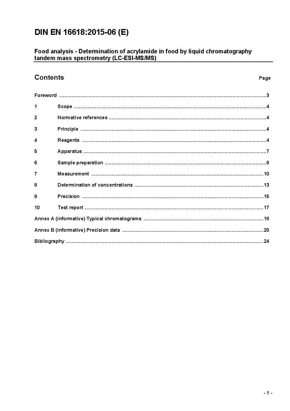 Food analysis - Determination of acrylamide in food by liquid chromatography tandem mass spectrometry (LC-ESI-MS/MS); German version EN 16618:2015