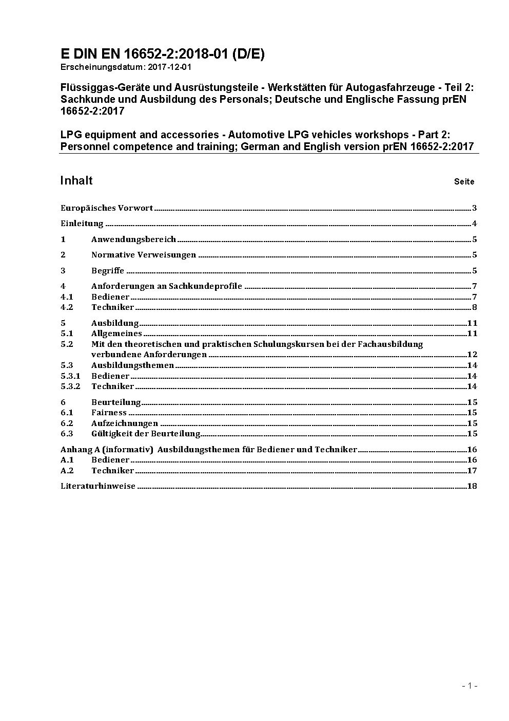 This draft European Standard defines the competence profiles, and establishes procedures for assessing the competence of persons who carry out the installation, repairing and maintaining of LPG systems in workshops covered in EN 16652 1. The requirements of this draft European standard do not apply to car manufacturer network repairers when performing the activities of repairing, servicing and maintenance of vehicles from manufacturers for which they are authorized and duly trained.