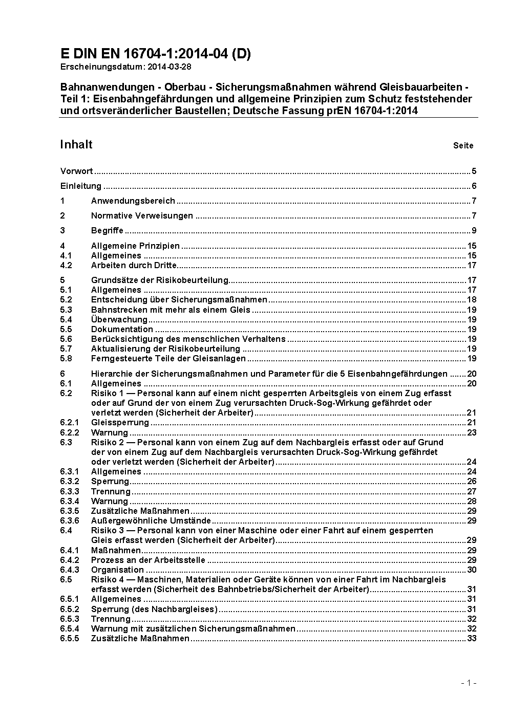 Railway applications - Track - Safety protection on the track during work - Part 1: Railway risks and common principles for protection of fixed and mobile work sites; German version EN 16704-1:2016