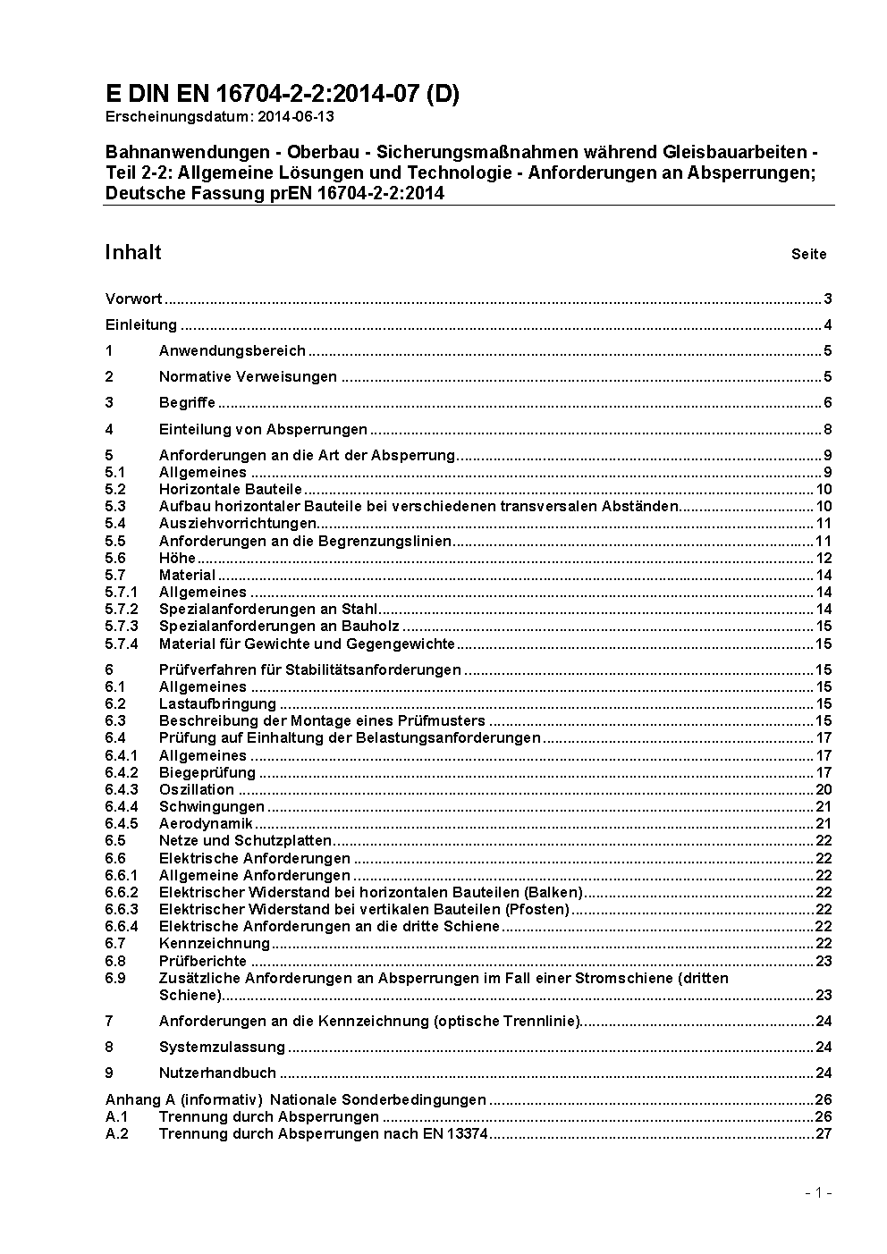 This European Standard deals with requirements for barriers to give users the possibility to prevent workers from entering the danger zone unintentionally by the use of such barriers. This standard defines minimum requirements and test procedures for these barriers concerning the dimensions, the stability and electrical properties. This standard also gives recommendations for the marking (visual demarcation line) where a person would enter the danger zone. For combinations of barriers and TWS see also EN 16704-2-1:2016. This standard contains references to electrical hazards from third rail systems. Note: Urban rail systems do have the same situations but may have other individual track gauges. EN 16704-1 does not cover Urban rail systems. The use of barriers as a safety measure has the same intention independently of the kind of railway systems. This standard does not deal with: - risk assessment for safety protection on the track during work; - hierarchy of safety measure for safety protection on the track during work; - safety measure to provide safe working and safe train operation in the area of a work site; - national safety regulations to plan and operate barriers in track; - safety regulations and additional requirements e. g. due to national or operational rules or negotiation between the user and the manufacturer; - electrical hazards by different potential of different electrified circuits.