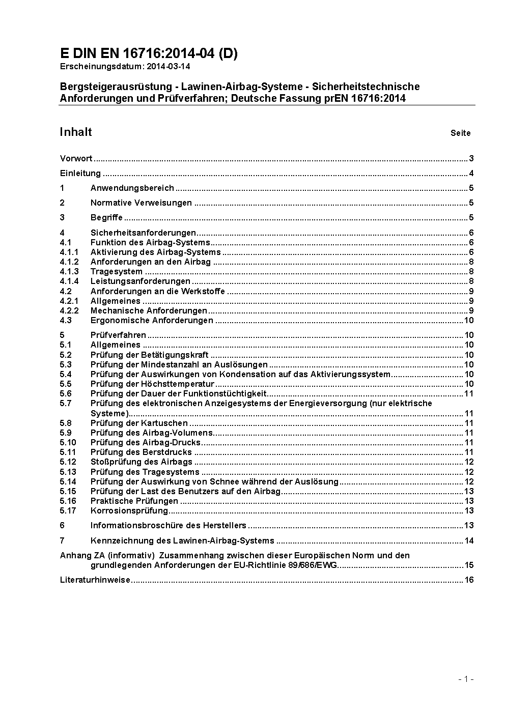Bergsteigerausrüstung - Lawinen-Airbag-Systeme - Sicherheitstechnische Anforderungen und Prüfverfahren; Deutsche und Englische Fassung prEN 16716:2025