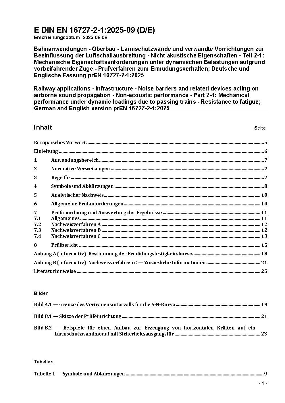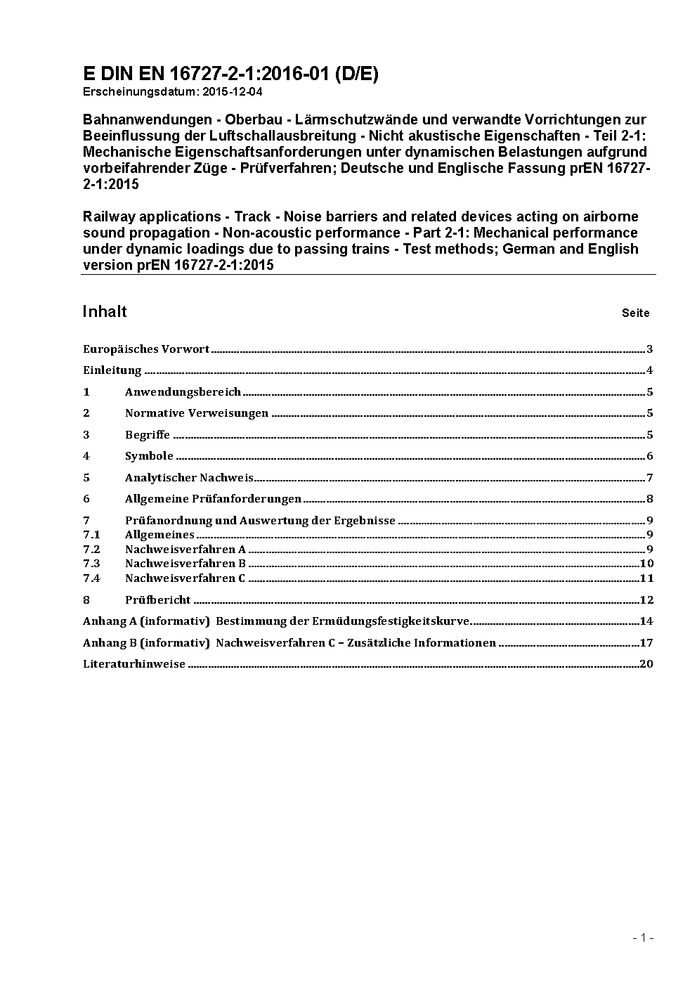 Railway applications - Track - Noise barriers and related devices acting on airborne sound propagation - Non-acoustic performance - Part 2-1: Mechanical performance under dynamic loadings due to passing trains - Test methods; German and English version prEN 16727-2-1:2015