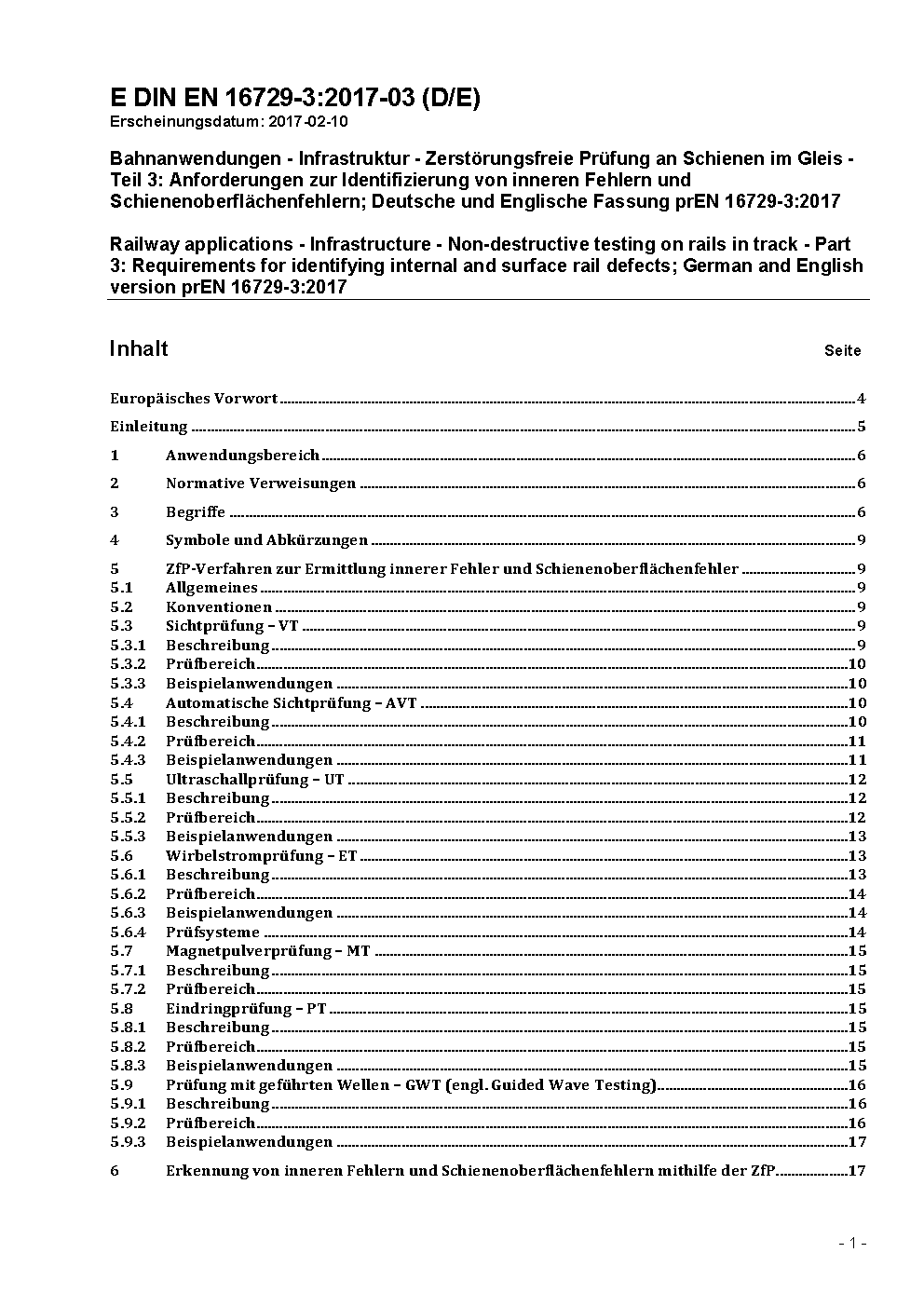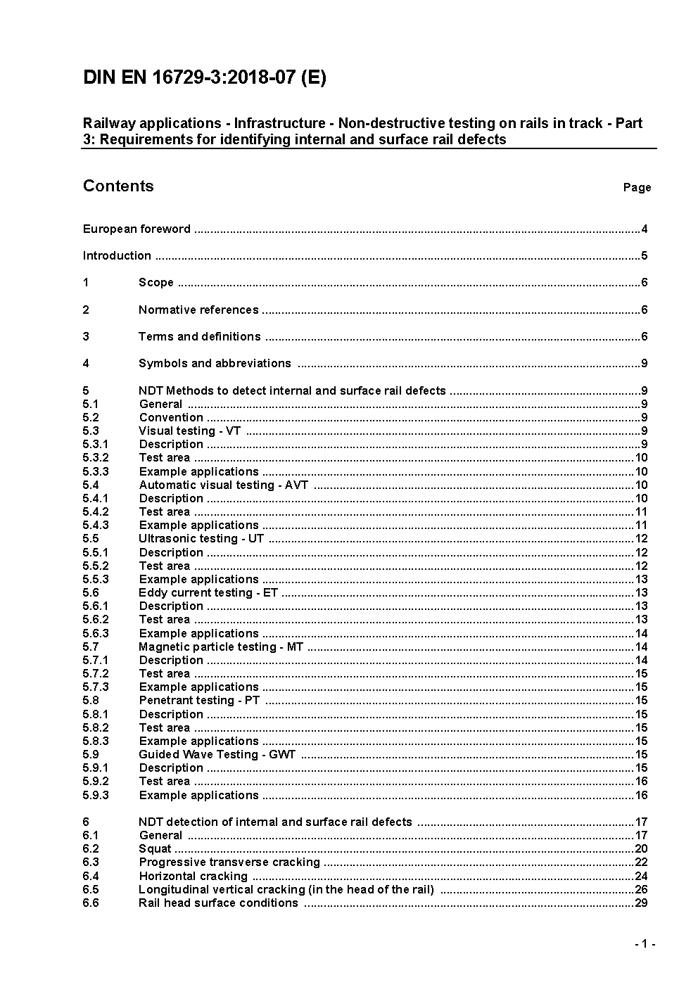 This part of this European Standard specifies the NDT methods used to detect internal and surface rail defects and the suitability of each method for the detection and evaluation of typical rail defects of rails installed in track.This part of this European Standard does not specify the assessment criteria of rail defects and the derived actions.This part of this European Standard applies only to rail profiles meeting the requirements of EN 13674-1.