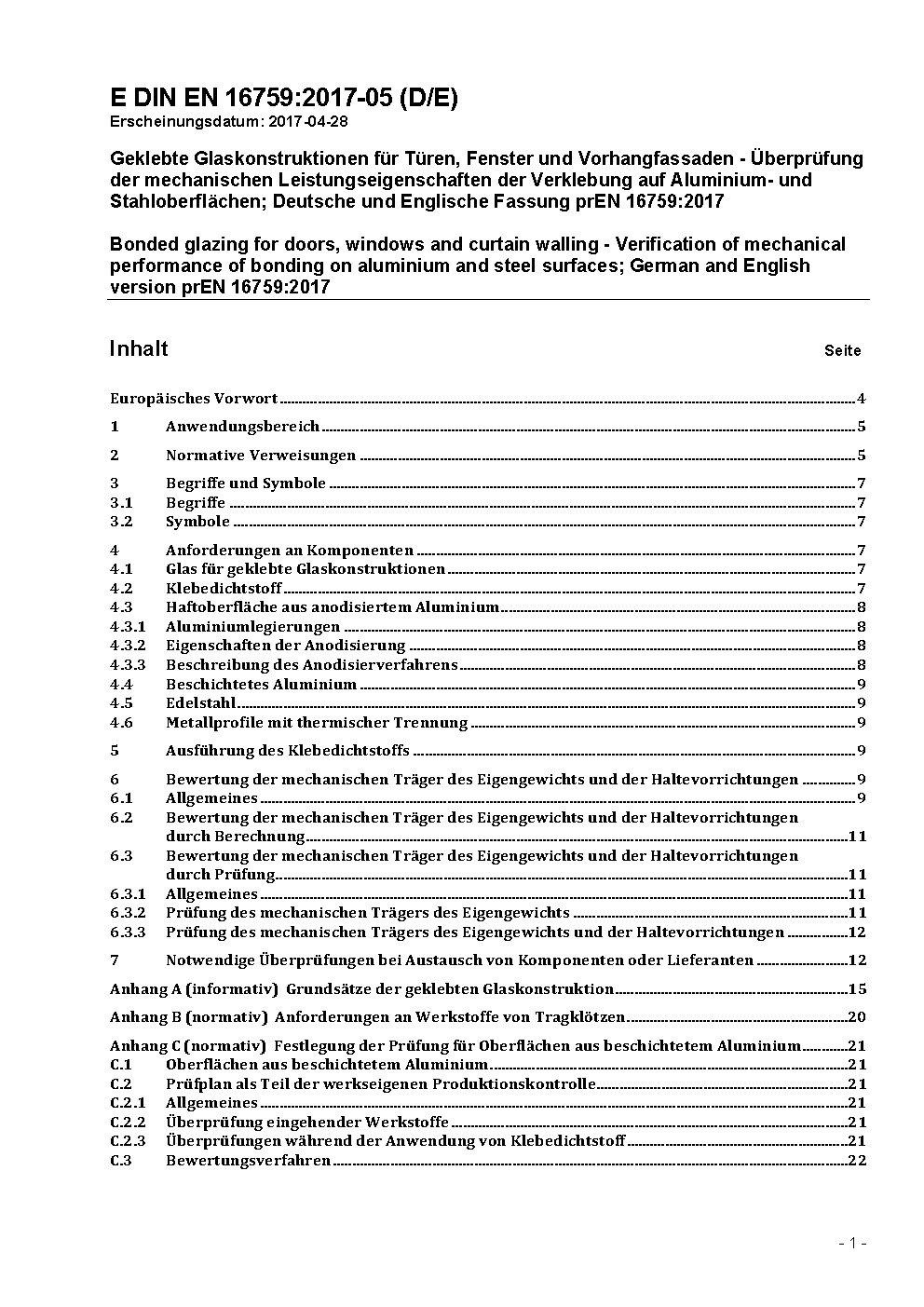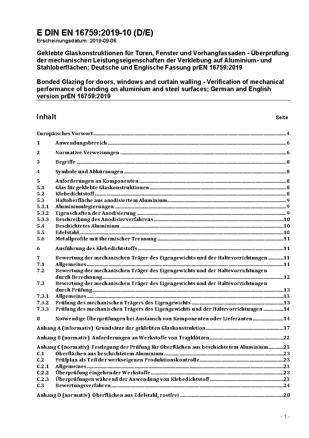 Bonded glazing for doors, windows and curtain walling - Verification of mechanical performance of bonding; German and English version prEN 16759:2016