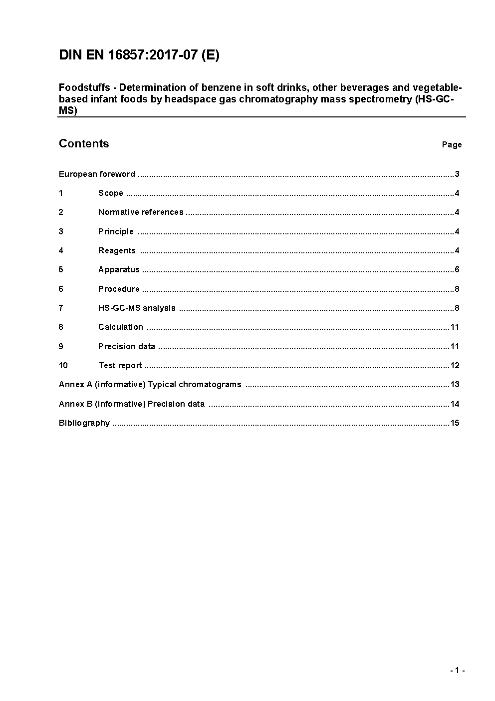 Foodstuffs - Determination of benzene in soft drinks, other beverages and vegetable-based infant foods by headspace gas chromatography mass spectrometry (HS-GC-MS); German version EN 16857:2017