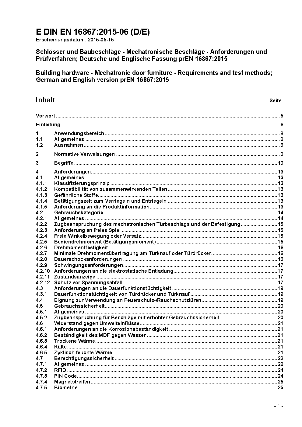 Building hardware - Mechatronic door furniture - Requirements and test methods; German and English version prEN 16867:2015