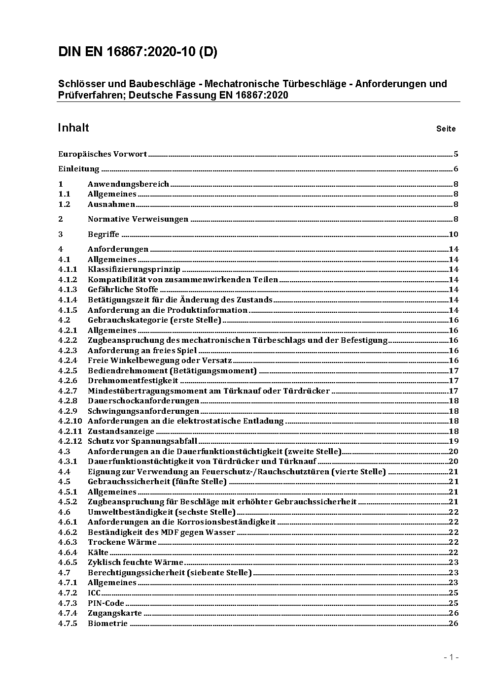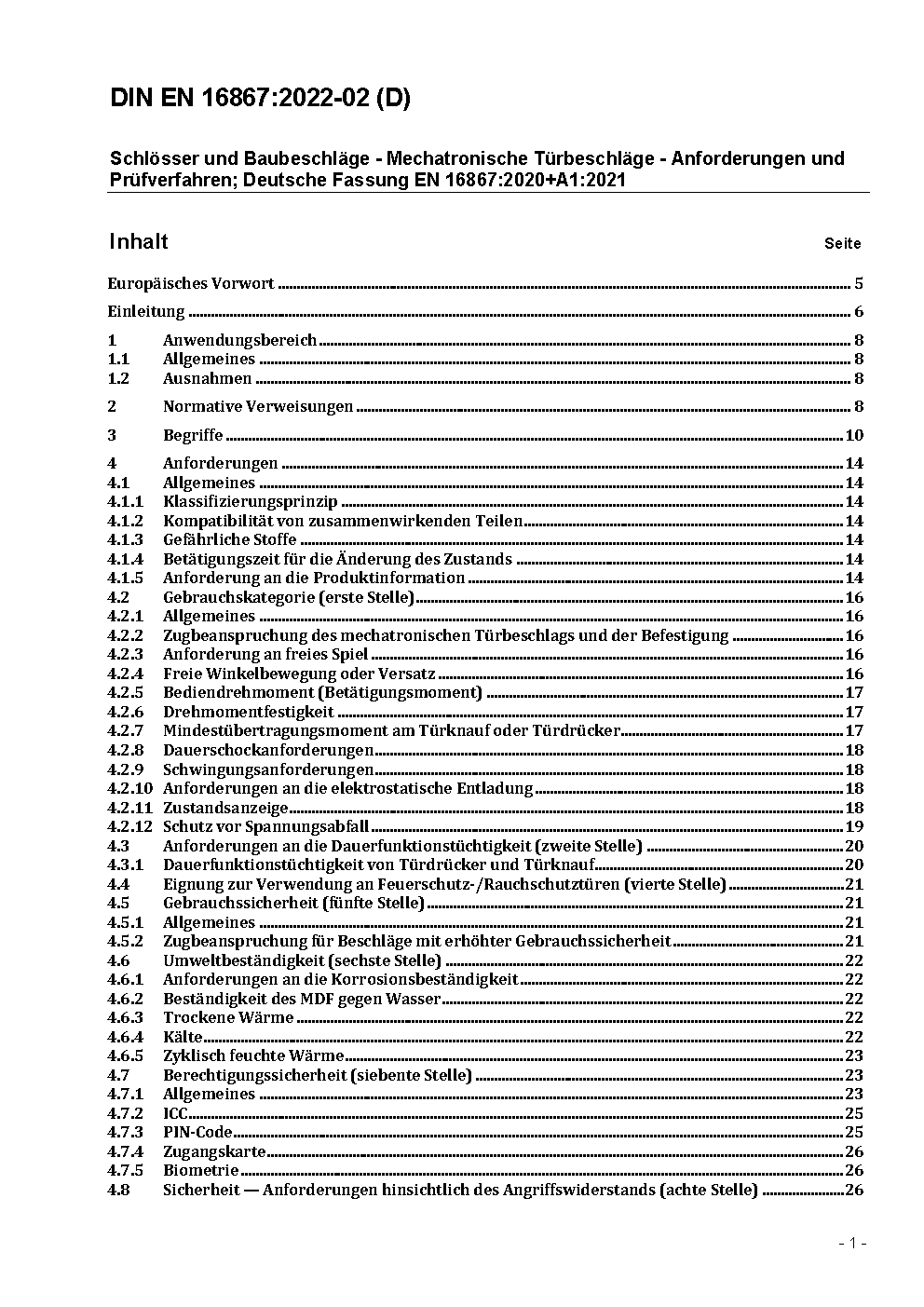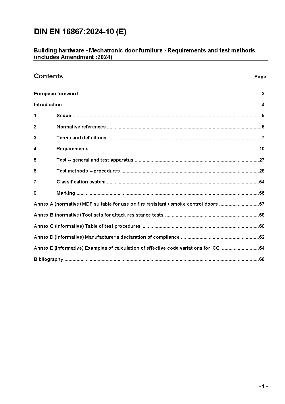 A mechatronic door furniture (MDF) fitted on the door set which gives the possibility to control the locking and/or release part in a door opening through an electronic authorisation means. This can be operable by credentials (i.e. card, code, biometric etc.). The mechatronic door furniture according to this standard is combined with locks according to EN 12209, EN 14846, prEN 15685 or is a part of an emergency exit devices according to EN 179, EN 1125 or prEN 13637. The mechatronic door furniture may be standalone or linkable to an external control system. The standard would allow classifying the mechatronic door furniture upon several characteristics such as category of use, durability, environmental, security, type of operating device. The suitability of the mechatronic door furniture for use on fire or smoke-door assemblies is determined by fire performance tests conducted in addition to the performance testing specified by this European standard, see Annex A. This European standard does not cover: Mechatronic cylinders according to EN 15684. Electromechanical operated locks and striking plates are according to EN 14846.