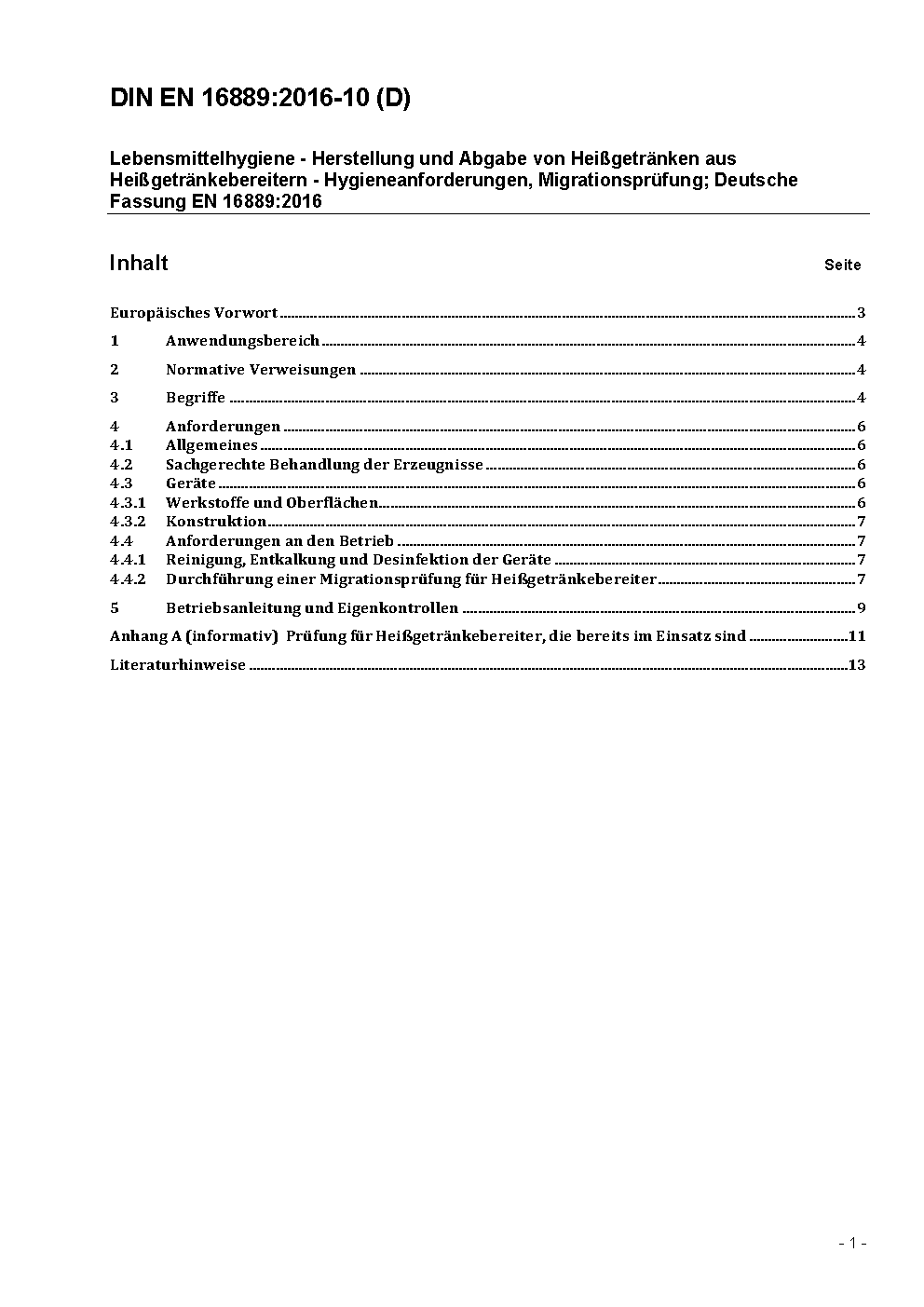 This draft standard specifies hygiene requirements which establish prerequisites for production of hot beverages, such as e. g. coffee and coffee specialities, tea, cocoa and dairy beverages from hot beverage appliances for commercial and household use in conformity with the food hygiene regulations and for placing on the market. Appliances for self-service are within the scope of this standard. For this purpose, the draft standard specifies general hygienic requirements for the construction, material and operation of the appliances concerned. It contains, in particular, requirements for hygienic and professional operation, for cleaning, disinfection and descaling as well as requirements for a migration test for new as well as for appliances in use. This draft standard does not deal with any requirements relevant to work safety. This draft standard deals neither with electrical safety nor with performance requirements. Standards DIN EN 60335-2-15 and DIN EN 60335-2-75 shall be used for commercially used appliances. Methods for measuring the performance of electric household coffee makers are provided in DIN EN 60661.