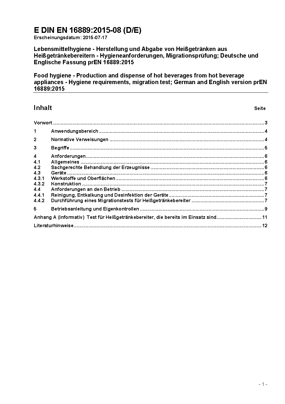 Food hygiene - Production and dispense of hot beverages from hot beverage appliances - Hygiene requirements, migration test; German and English version prEN 16889:2015