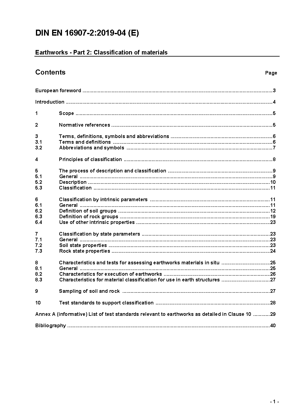 This standard defines a common basis for description and classification for use by all parties involved in the design, planning and construction of the earthworks.This standard specifies the principles of classification, the processes and properties to be used in the description and classification of earthworks materials. For that, it specifies soil and rock groups as basis of material specifications for earth structure elements.Informative examples of existing national experience based classification systems and their use are presented.