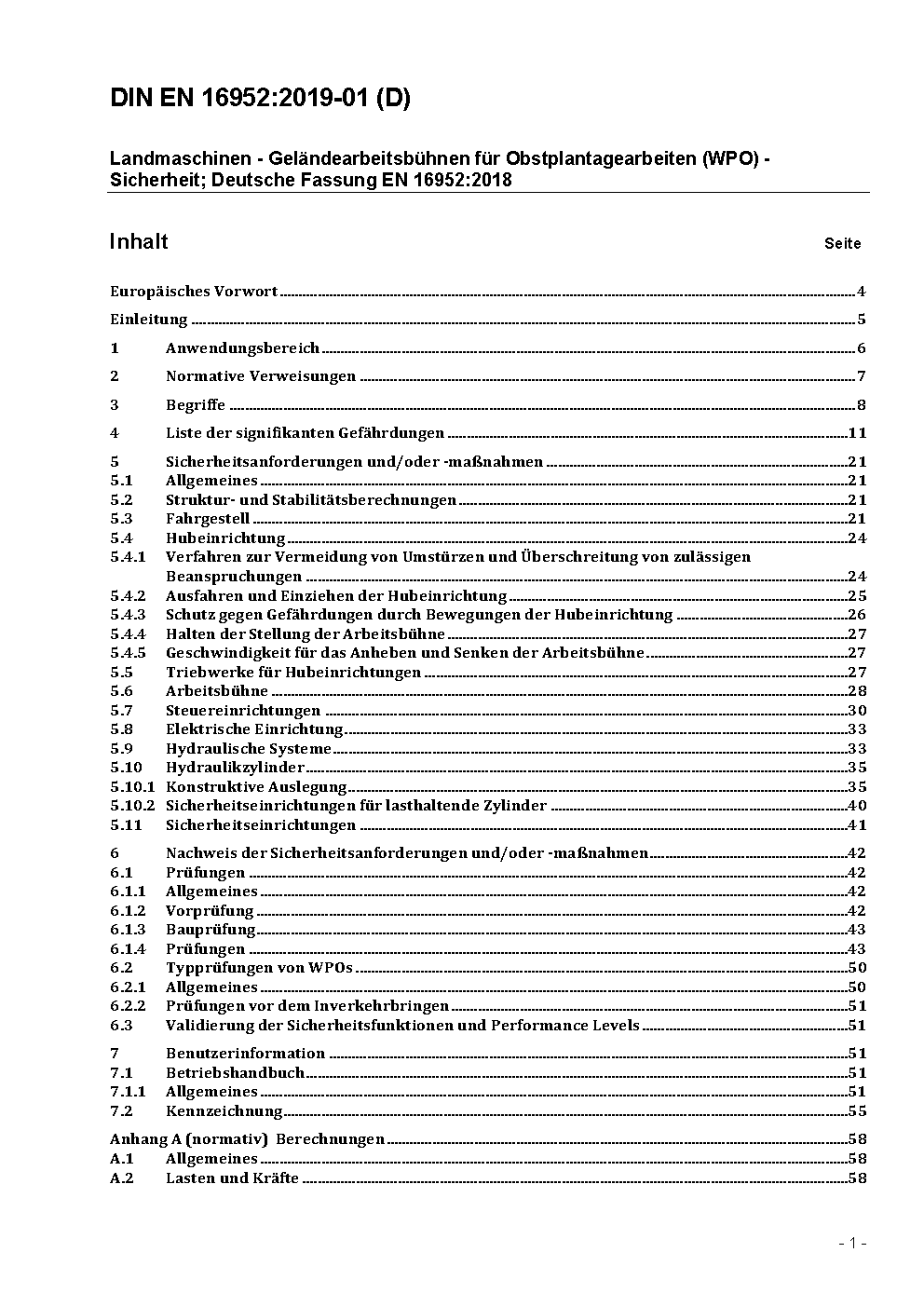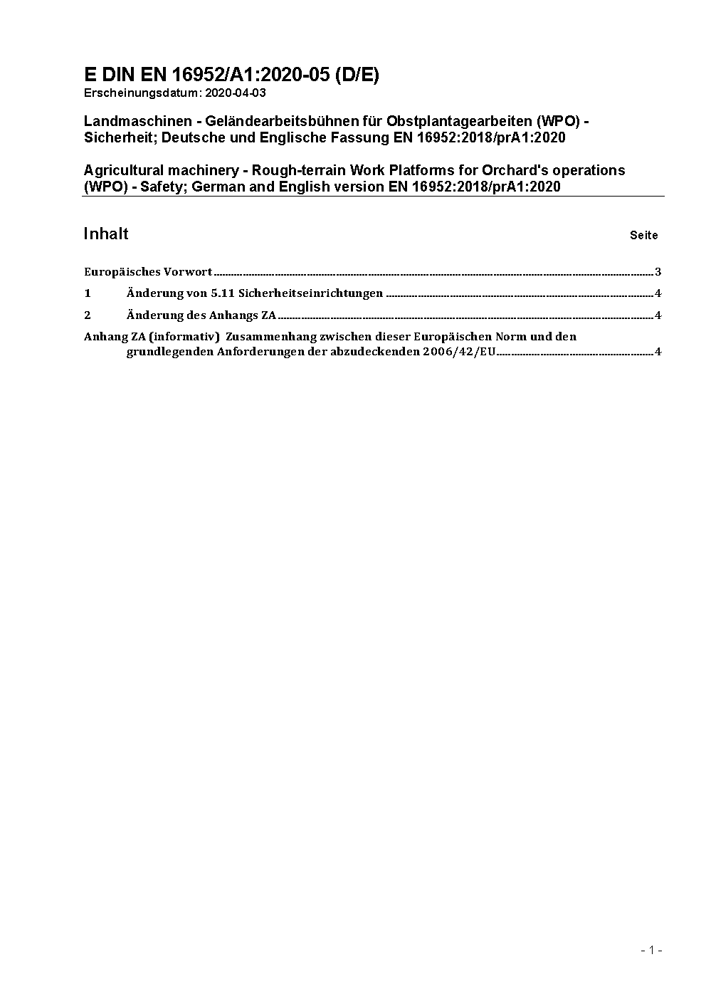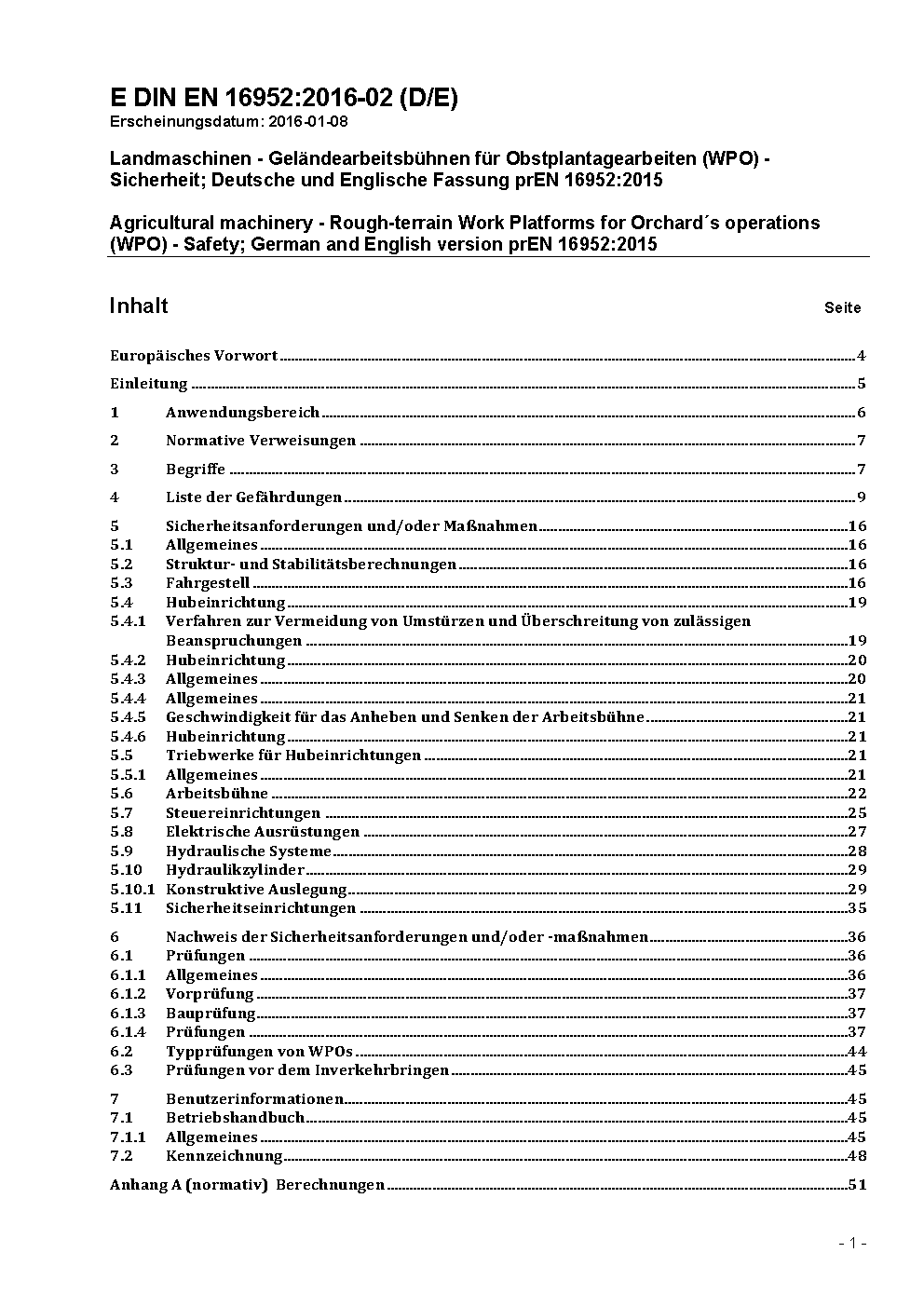 Agricultural machinery - Rough-terrain Work Platforms for Orchard´s operations (WPO) - Safety; German and English version prEN 16952:2015