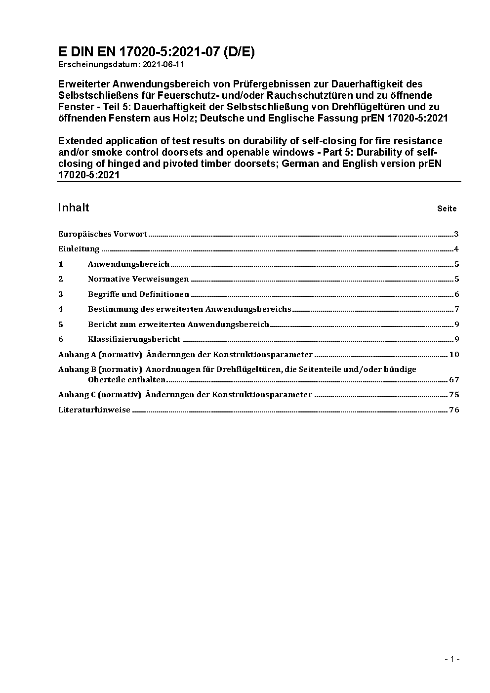 Erweiterte Anwendung von Prüfergebnissen zur Dauerhaftigkeit der Selbstschließung für Feuerschutz- und/oder Rauchschutztüren und zu öffnende Fenster - Teil 5: Dauerhaftigkeit der Selbstschließung von Drehflügeltüren und zu öffnenden Fenstern aus Holz; Deutsche Fassung EN 17020-5:2023