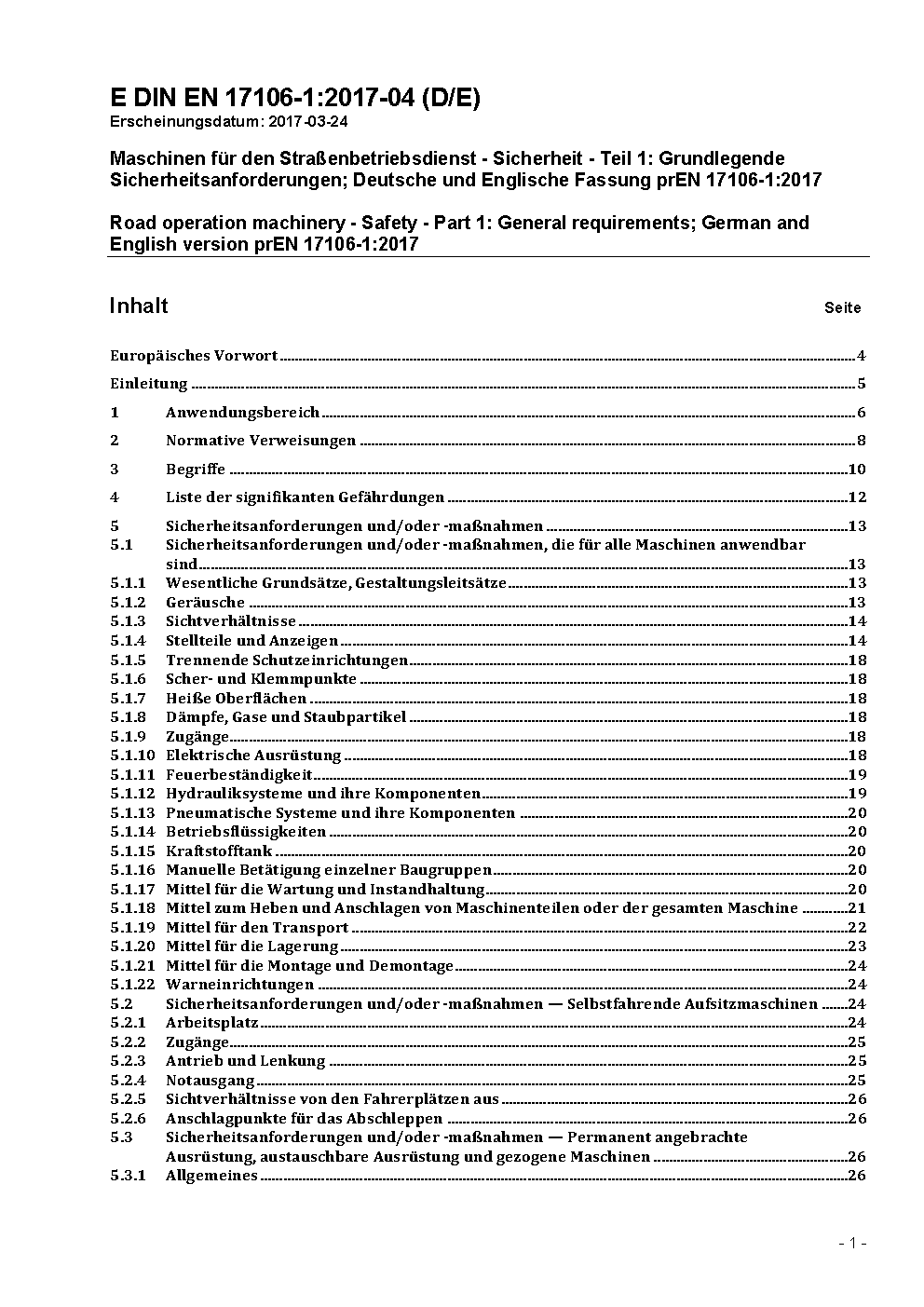 Road operation machinery - Safety - Part 1: General requirements; German and English version prEN 17106-1:2017