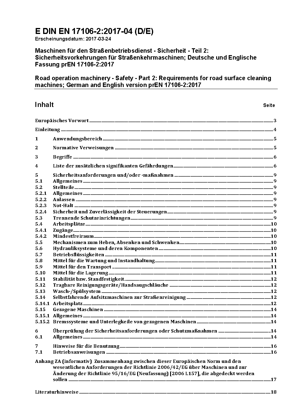 Road operation machinery - Safety - Part 2: Requirements for road surface cleaning machines; German and English version prEN 17106-2:2017