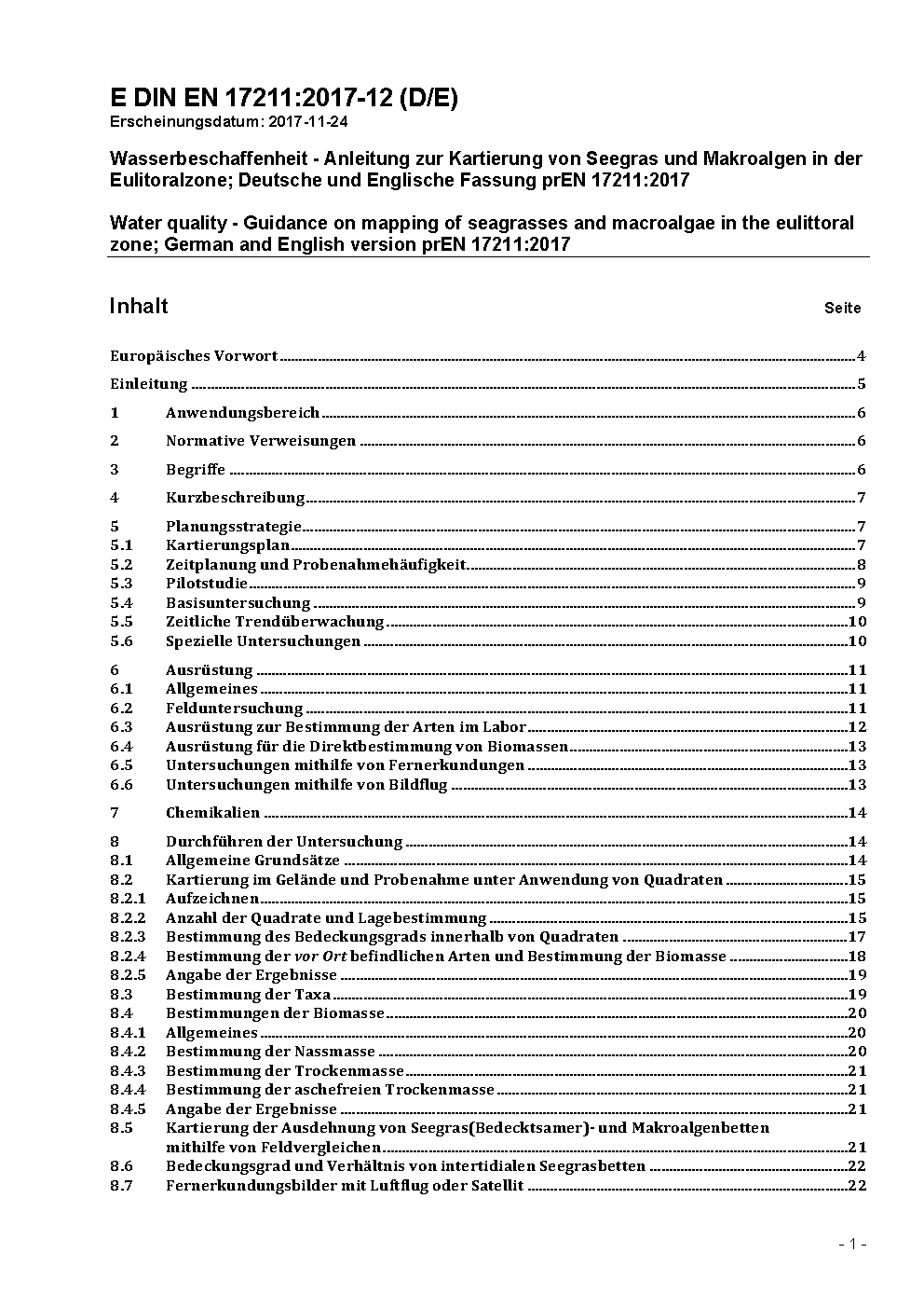 Wasserbeschaffenheit - Anleitung zur Kartierung von Seegras und Makroalgen in der Eulitoralzone; Deutsche Fassung EN 17211:2019