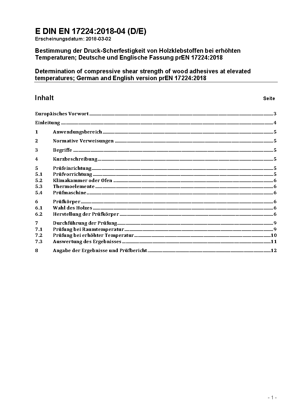 Bestimmung der Druck-Scherfestigkeit von Holzklebstoffen bei erhöhten Temperaturen; Deutsche Fassung EN 17224:2019