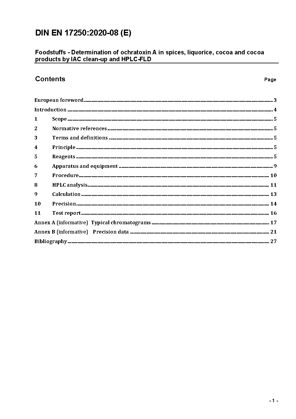 Foodstuffs - Determination of ochratoxin A in paprika, chilli, black & white pepper, nutmeg, spice mix, liquorice, cocoa and cocoa products by immunoaffinity column clean-up and high performance liquid chromatography with fluorescence detection; German and English version prEN 17250:2018