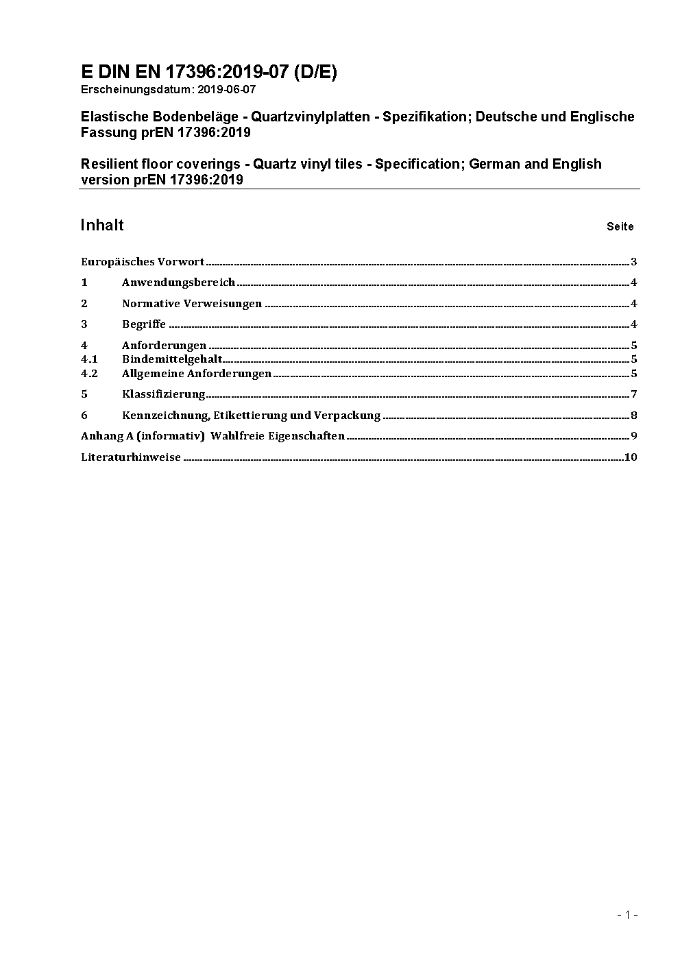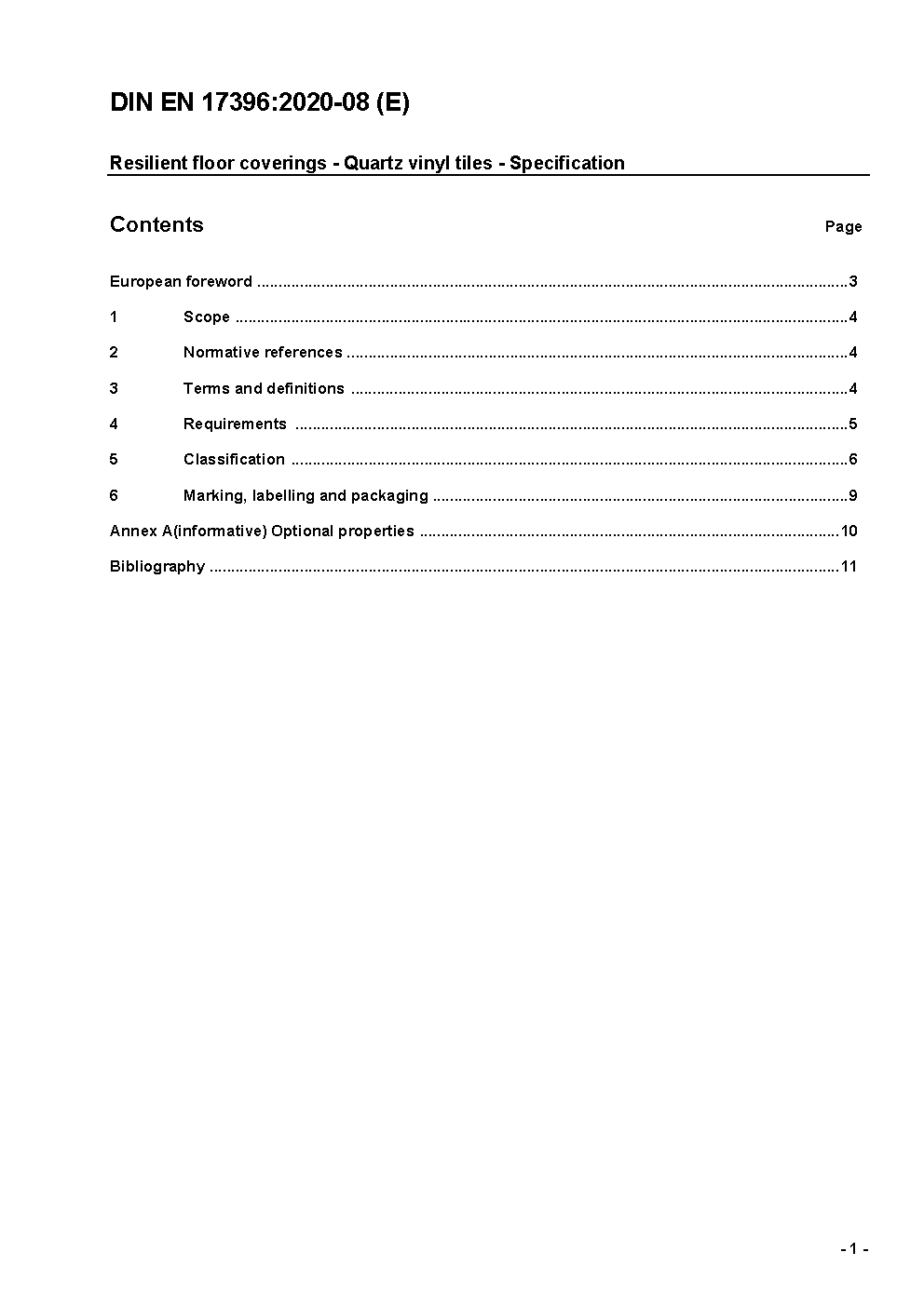 Resilient floor coverings - Quartz vinyl tiles - Specification; German version EN 17396:2020