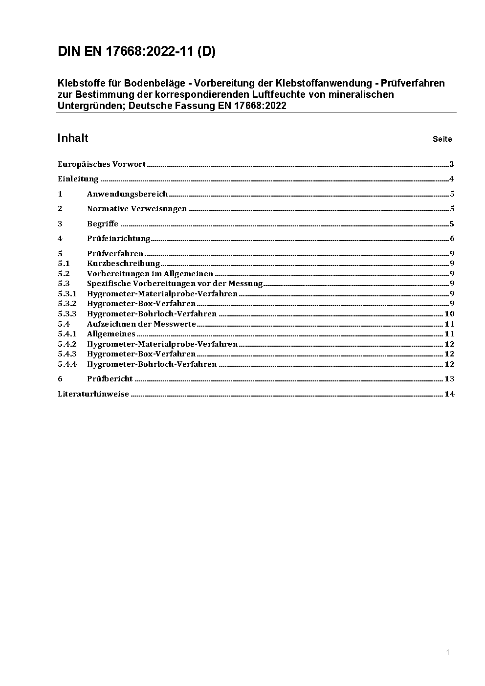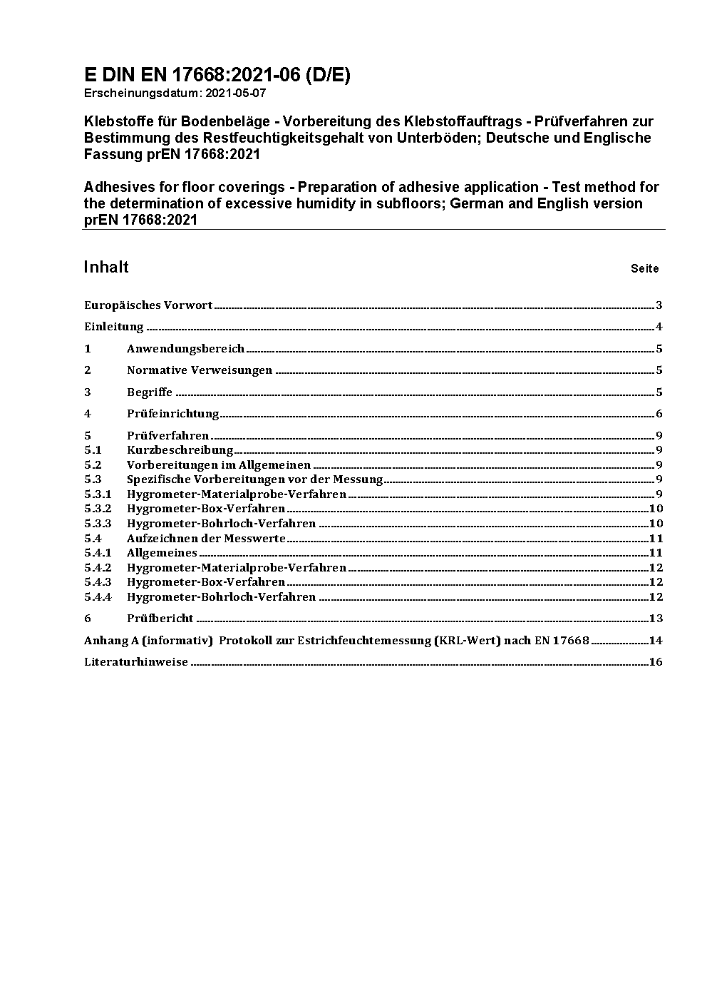 Klebstoffe für Bodenbeläge - Vorbereitung des Klebstoffauftrags - Prüfverfahren zur Bestimmung des Restfeuchtigkeitsgehalt von Unterböden; Deutsche und Englische Fassung prEN 17668:2021