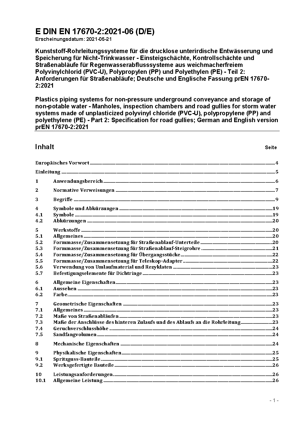 Kunststoff-Rohrleitungssysteme für die drucklose unterirdische Ableitung von Niederschlagswasser - Weichmacherfreies Polyvinylchlorid (PVC-U), Polypropylen (PP) und Polyethylen (PE) - Teil 2: Anforderungen an Straßenabläufe; Deutsche Fassung EN 17670-2:2023