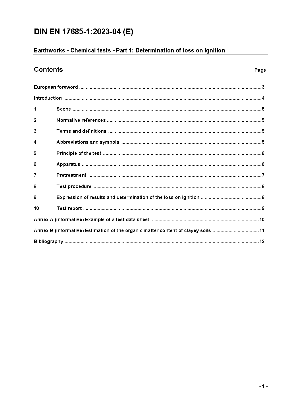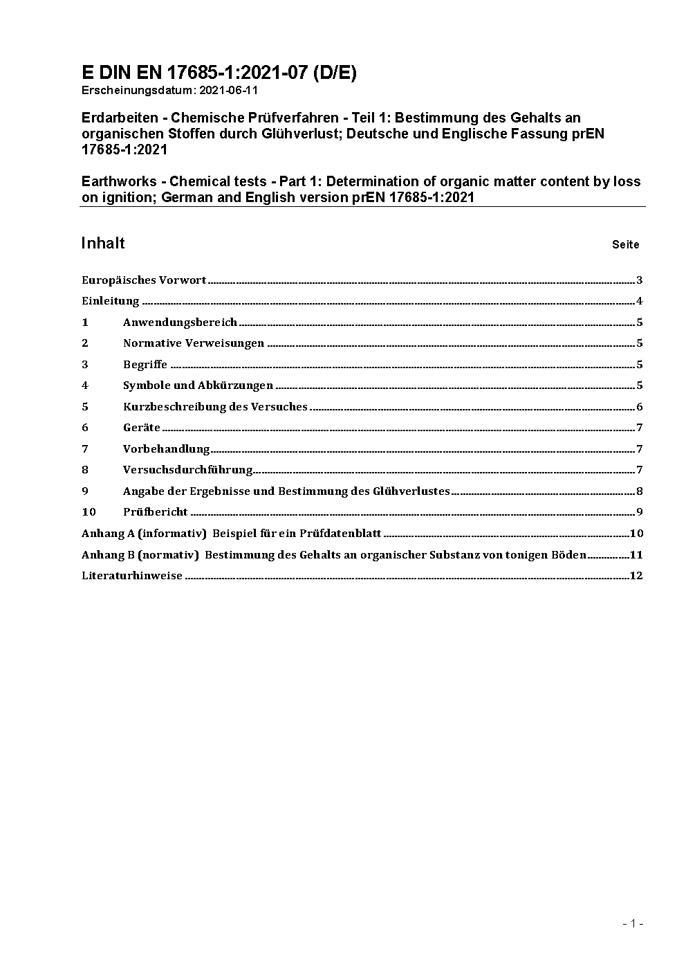 Erdarbeiten - Chemische Prüfverfahren - Teil 1: Bestimmung des Gehalts an organischen Stoffen durch Glühverlust; Deutsche und Englische Fassung prEN 17685-1:2021
