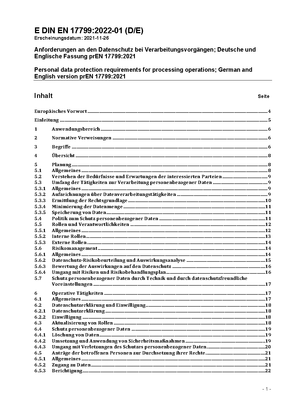 Personal data protection requirements for processing operations; German and English version prEN 17799:2021