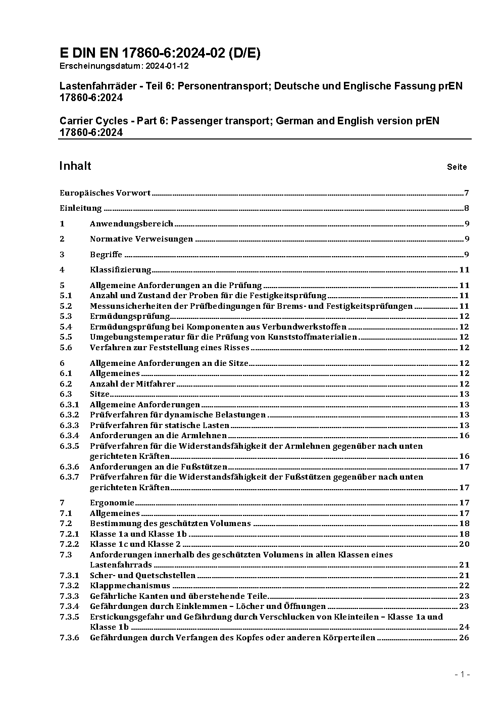 Lastenfahrräder - Teil 6: Personentransport; Deutsche und Englische Fassung prEN 17860-6:2024