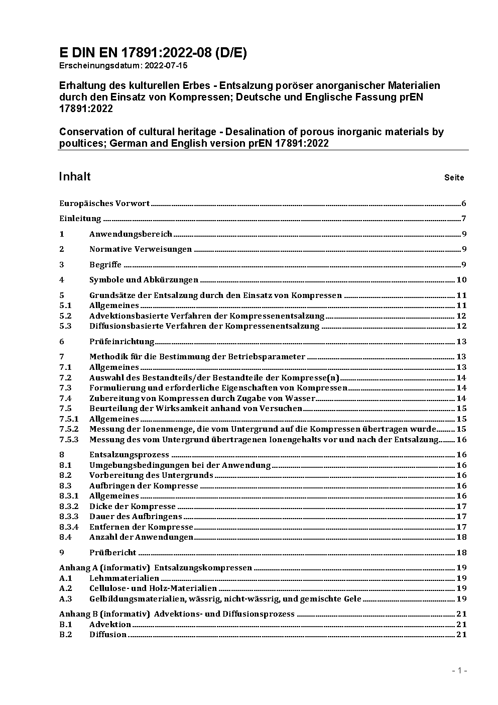 Erhaltung des kulturellen Erbes - Entsalzung poröser anorganischer Materialien durch den Einsatz von Kompressen; Deutsche und Englische Fassung prEN 17891:2022