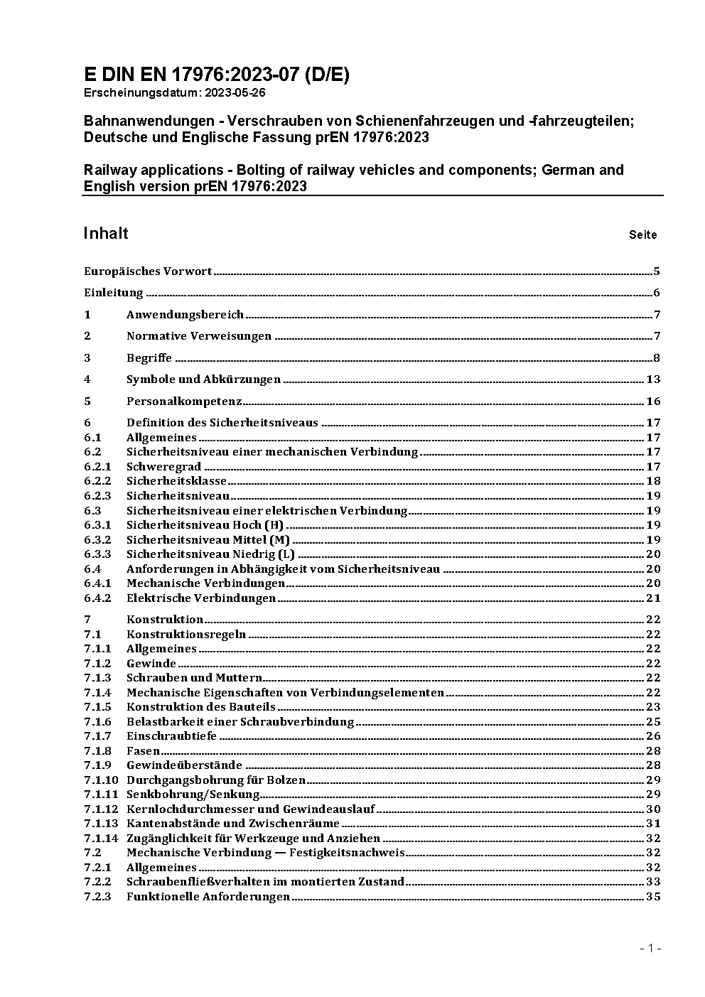 Bahnanwendungen - Verschrauben von Schienenfahrzeugen und -fahrzeugteilen; Deutsche und Englische Fassung prEN 17976:2023