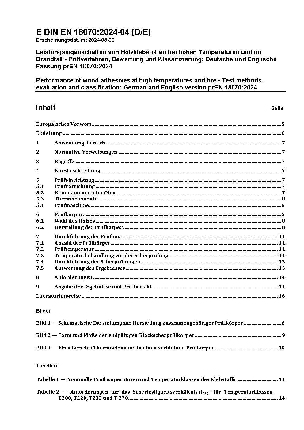 Leistungseigenschaften von Holzklebstoffen bei hohen Temperaturen und im Brandfall - Prüfverfahren, Bewertung und Klassifizierung; Deutsche und Englische Fassung prEN 18070:2024