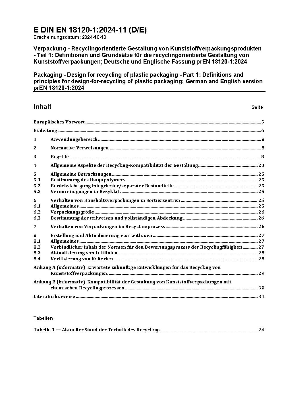 Verpackung - Recyclingorientierte Gestaltung von Kunststoffverpackungsprodukten - Teil 1: Definitionen und Grundsätze für die recyclingorientierte Gestaltung von Kunststoffverpackungen; Deutsche und Englische Fassung prEN 18120-1:2024