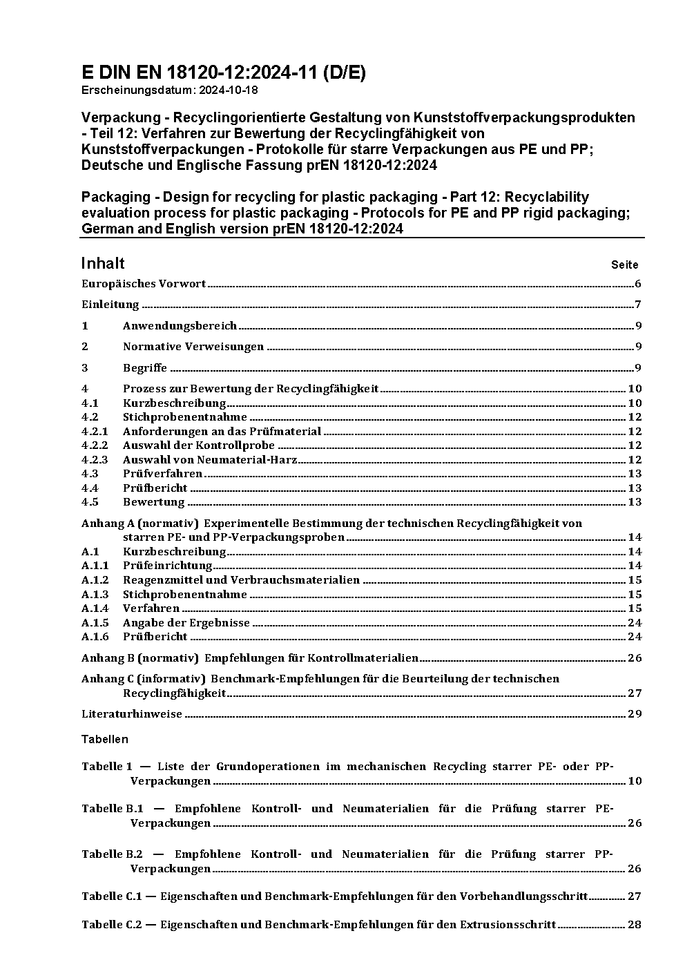 Verpackung - Recyclingorientierte Gestaltung von Kunststoffverpackungsprodukten - Teil 12: Verfahren zur Bewertung der Recyclingfähigkeit von Kunststoffverpackungen - Protokolle für starre Verpackungen aus PE und PP; Deutsche und Englische Fassung prEN 18120-12:2024