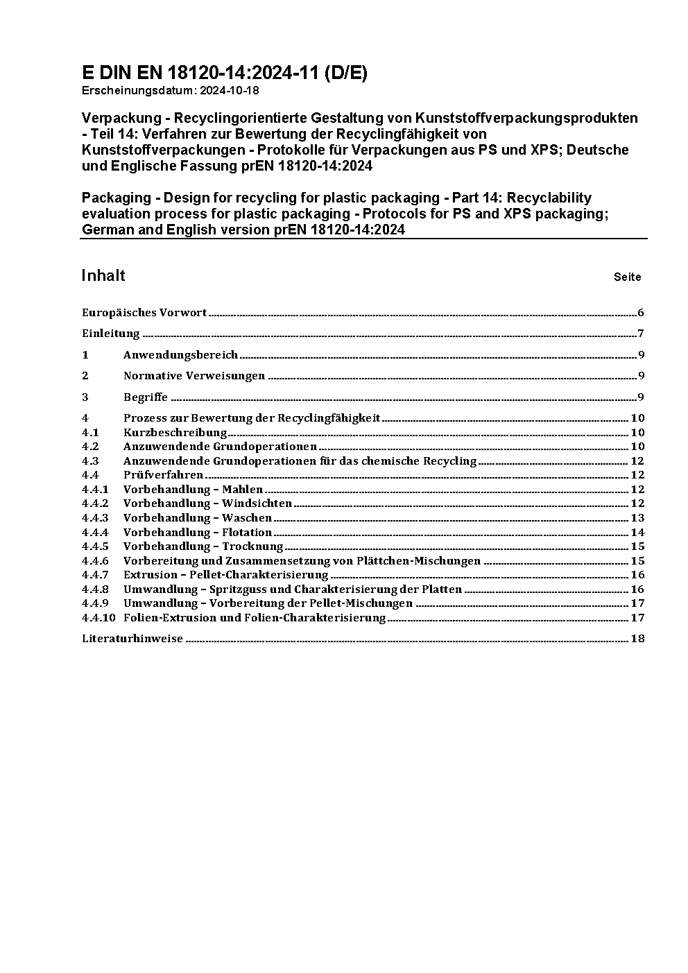 Verpackung - Recyclingorientierte Gestaltung von Kunststoffverpackungsprodukten - Teil 14: Verfahren zur Bewertung der Recyclingfähigkeit von Kunststoffverpackungen - Protokolle für Verpackungen aus PS und XPS; Deutsche und Englische Fassung prEN 18120-14:2024