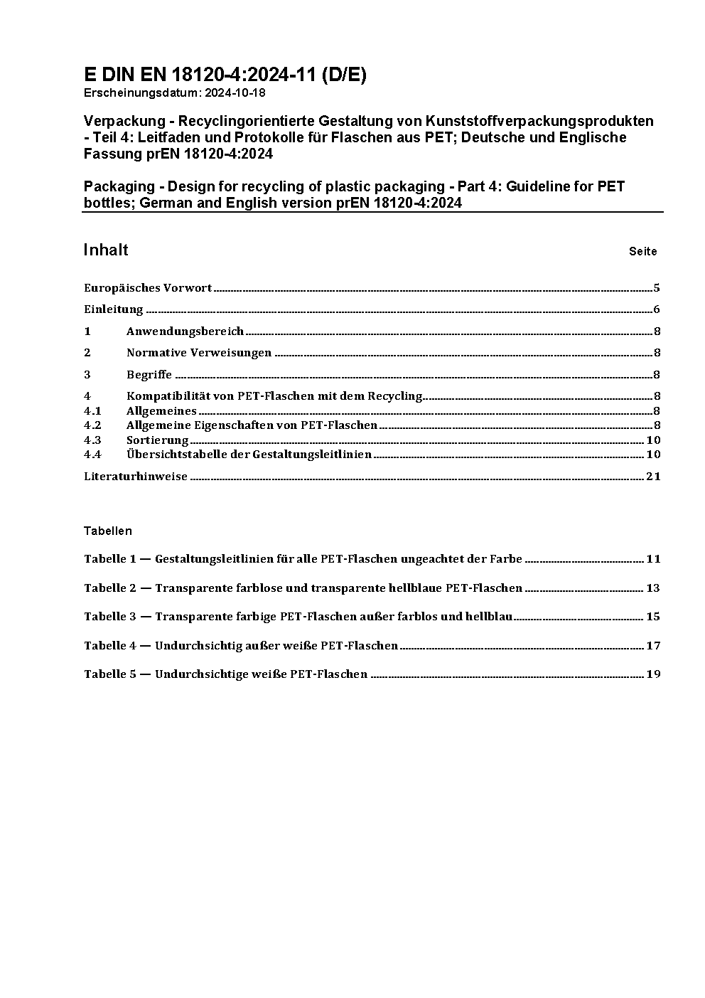 Verpackung - Recyclingorientierte Gestaltung von Kunststoffverpackungsprodukten - Teil 4: Leitfaden und Protokolle für Flaschen aus PET; Deutsche und Englische Fassung prEN 18120-4:2024