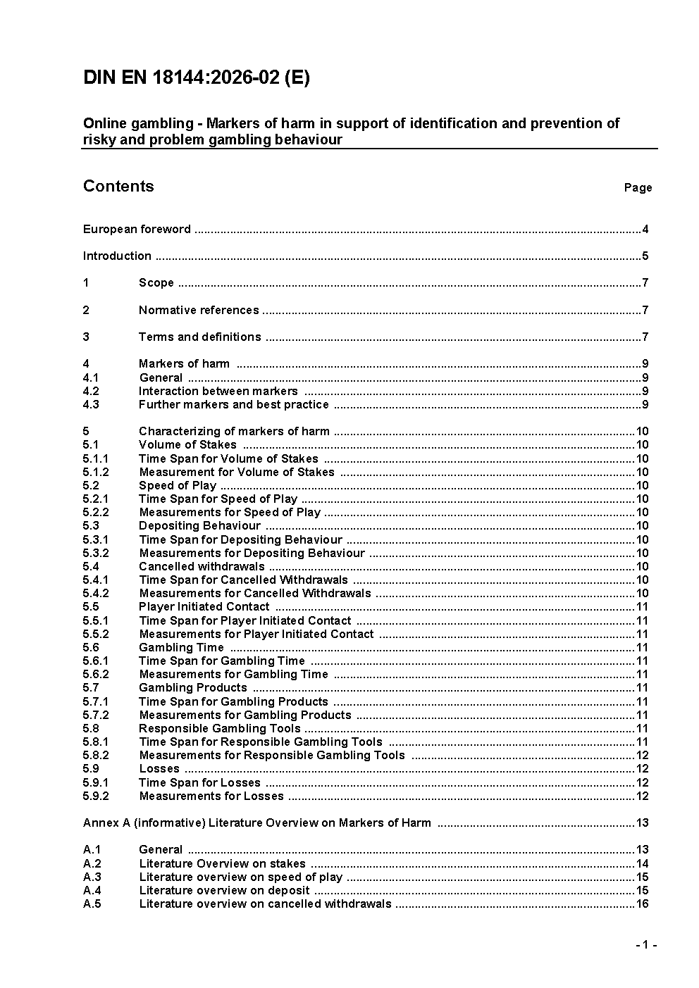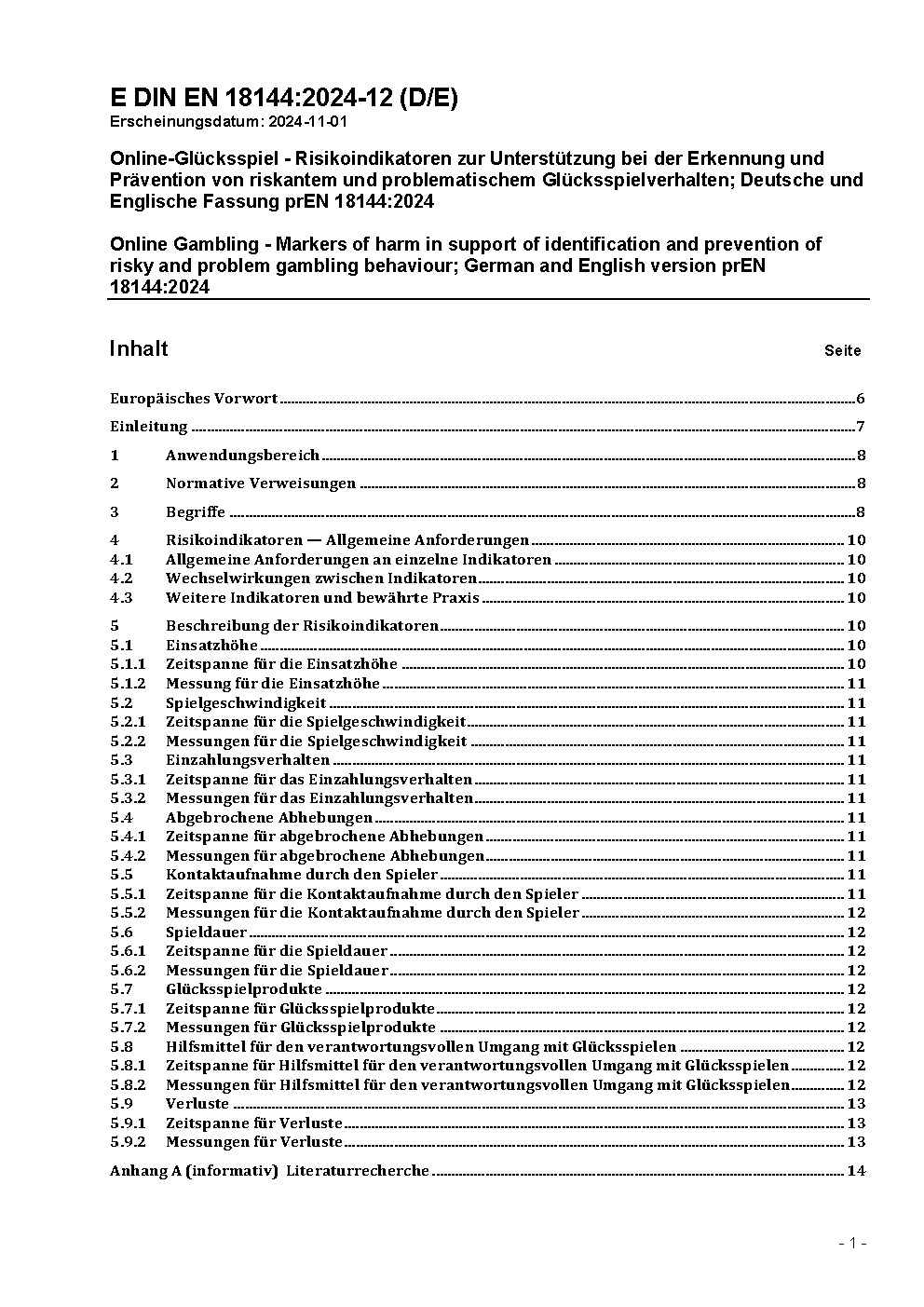 Online gambling - Markers of harm in support of identification and prevention of risky and problem gambling behaviour; German version EN 18144:2025