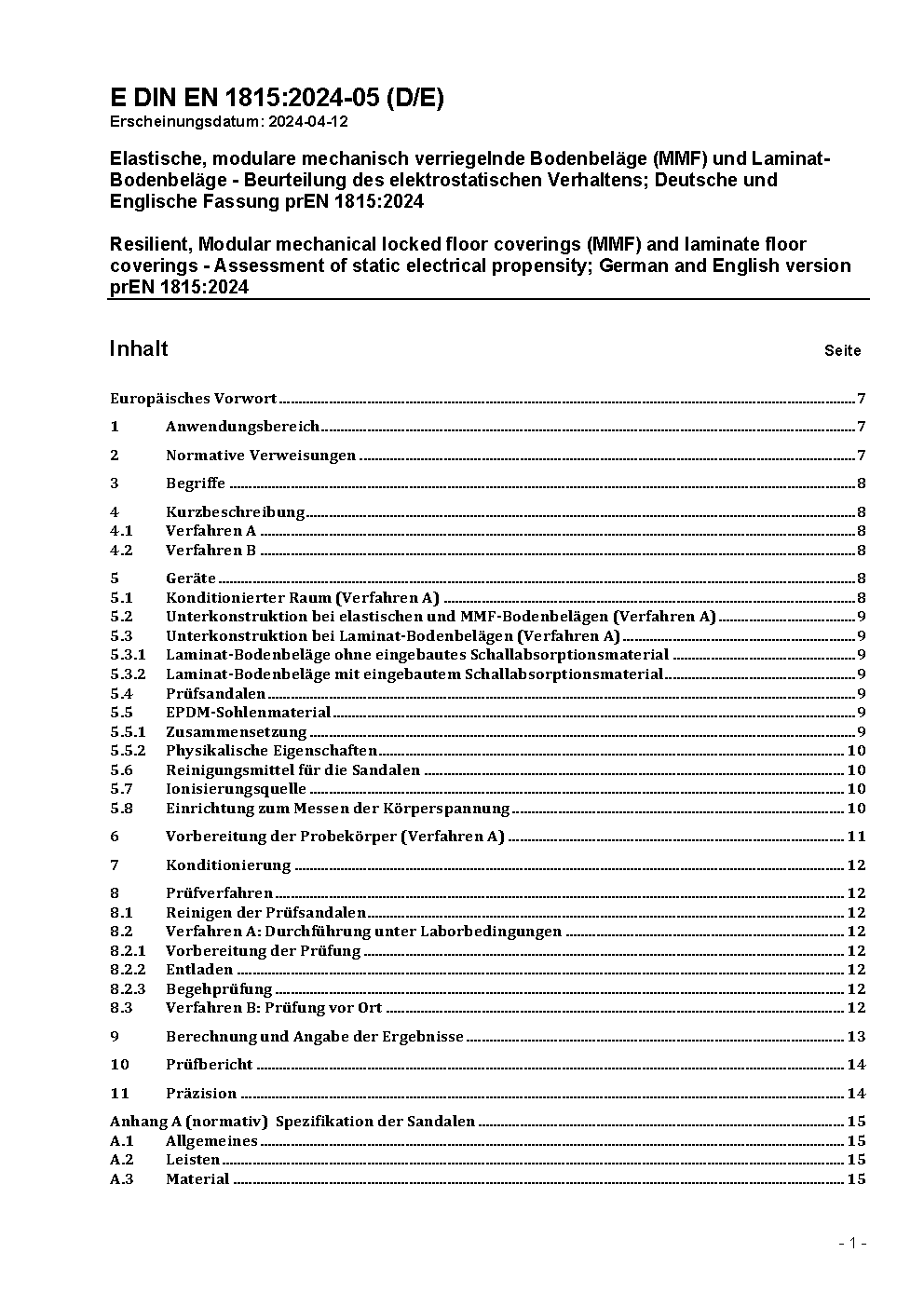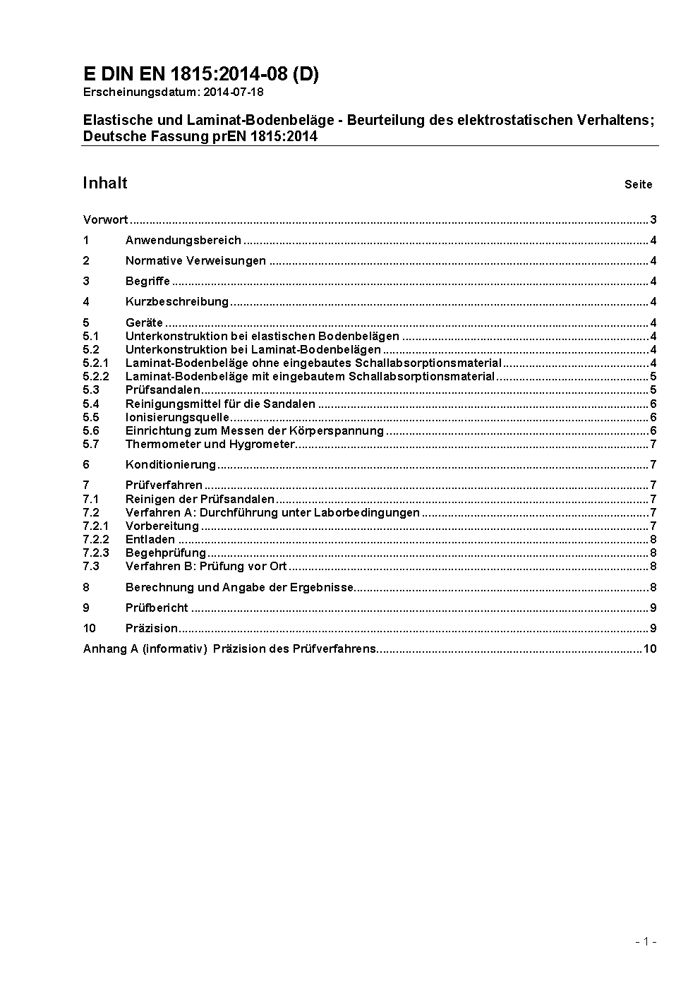Resilient and textile floor coverings - Assessment of static electrical propensity; German version EN 1815:1997