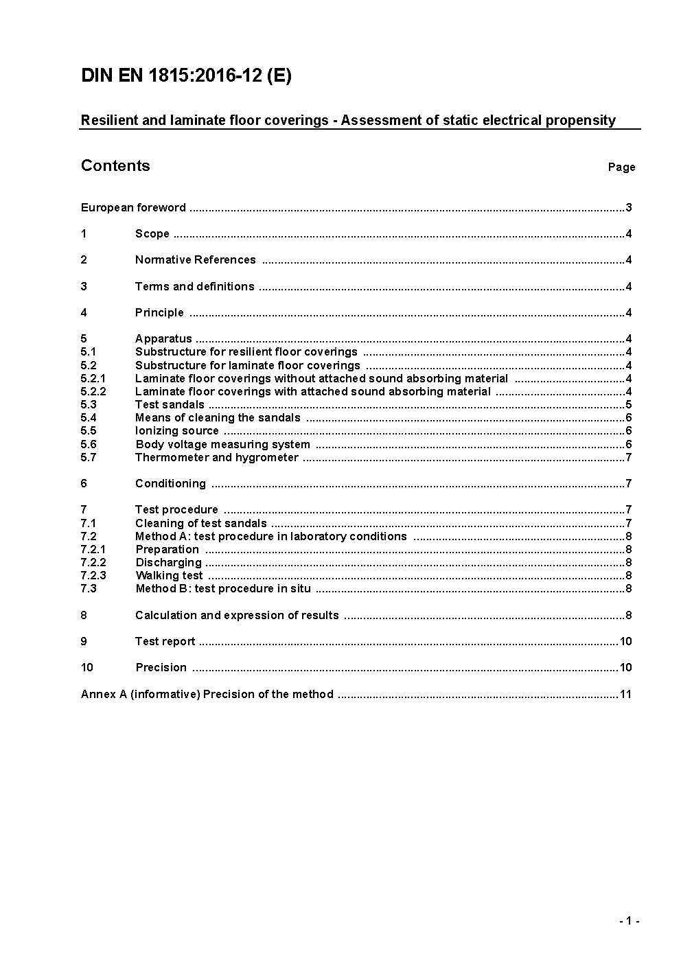 The document specifies a method for determining the body voltage generated when a person wearing standardized footwear walks on a resilient floor covering.